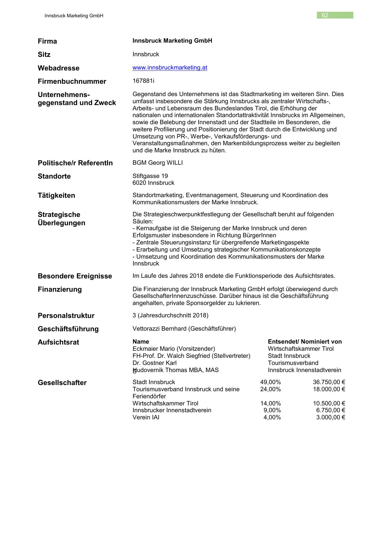 Die Finanzierung der Innsbruck Marketing GmbH erfolgt überwiegend durch