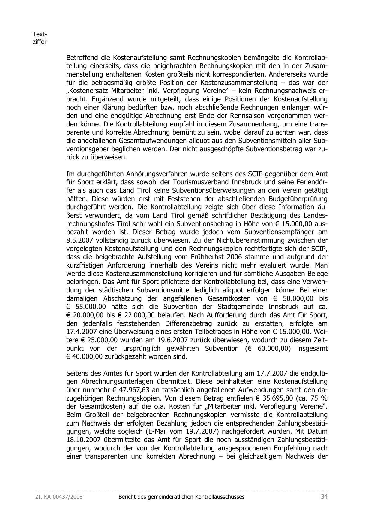 18.10.2007 übermittelte das Amt für Sport die noch ausständigen Zahlungsbestätigungen, wodurch der von der Kontrollabteilung ausgesprochenen Empfehlung nach