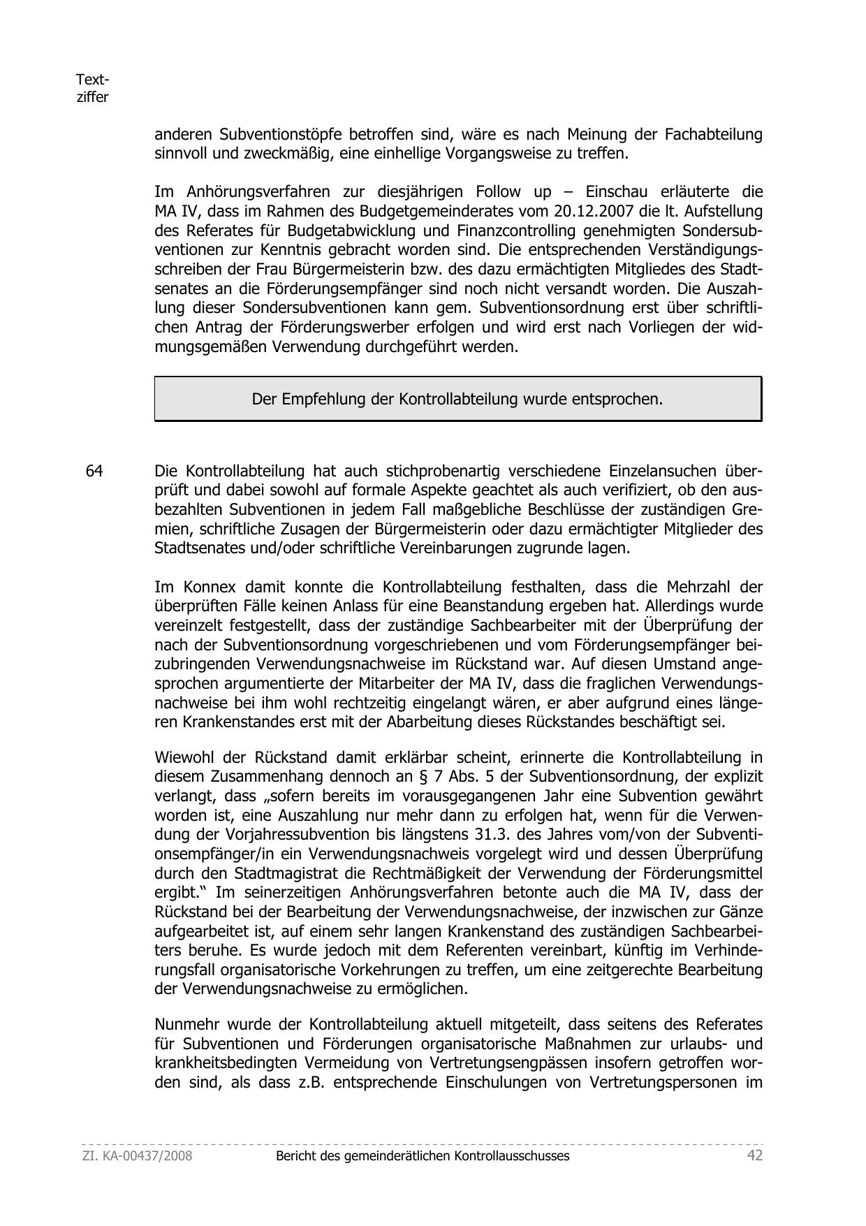Die Kontrollabteilung hat auch stichprobenartig verschiedene Einzelansuchen überprüft und dabei sowohl auf formale Aspekte geachtet als auch verifiziert, ob den ausbezahlten Subventionen in jedem Fall maßgebliche Beschlüsse der zuständigen Gremien, schriftliche Zusagen der Bürgermeisterin oder dazu ermächtigter Mitglieder des