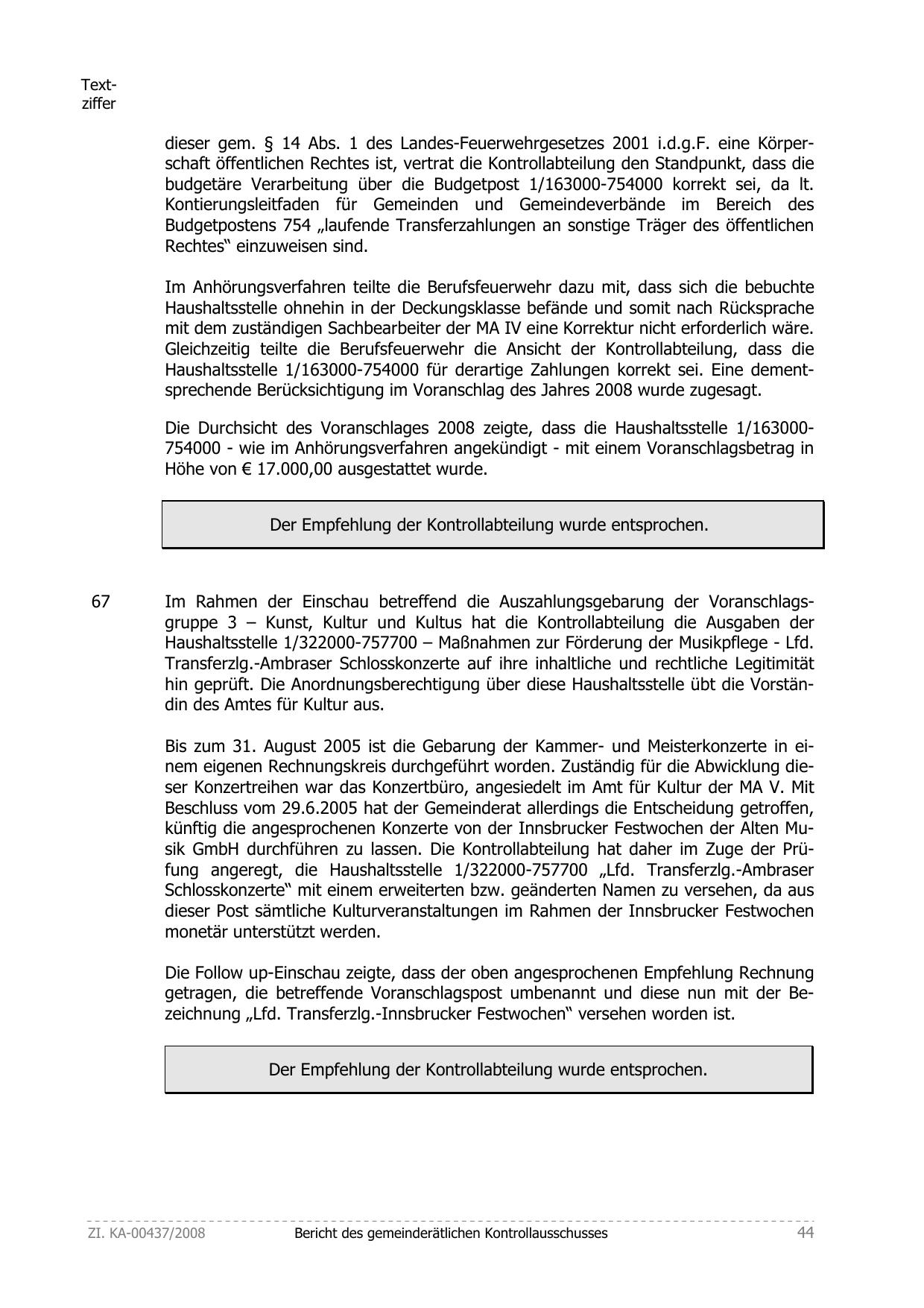 künftig die angesprochenen Konzerte von der Innsbrucker Festwochen der Alten Musik GmbH durchführen zu lassen. Die Kontrollabteilung hat daher im Zuge der Prüfung angeregt, die Haushaltsstelle 1/322000-757700 „Lfd. Transferzlg.-Ambraser