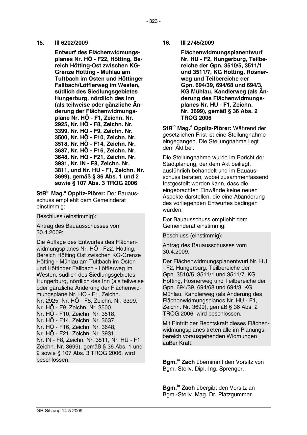 (als teilweise oder gänzliche Änderung der Flächenwidmungspläne Nr. HÖ - F1, Zeichn. Nr.