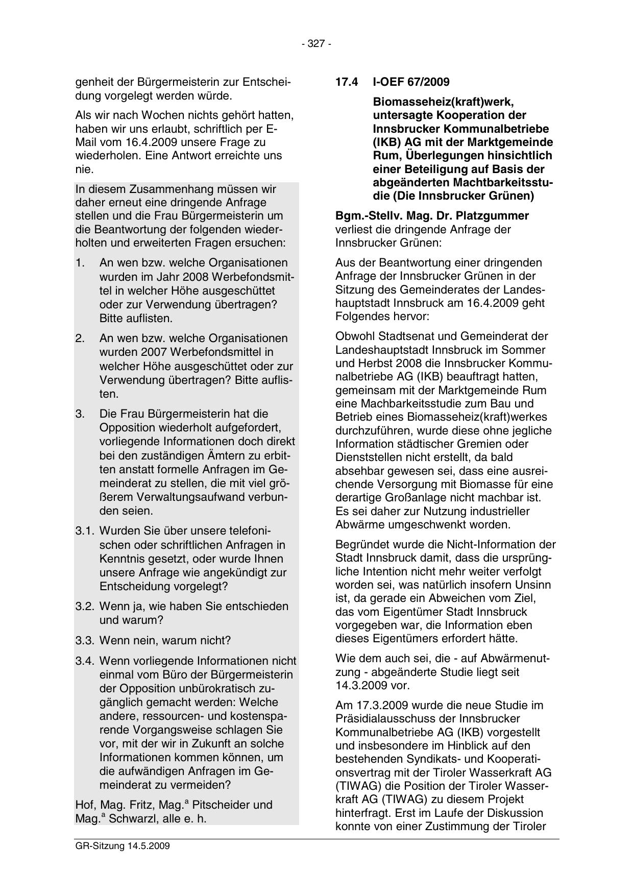 Sitzung des Gemeinderates der Landeshauptstadt Innsbruck am 16.4.2009 geht