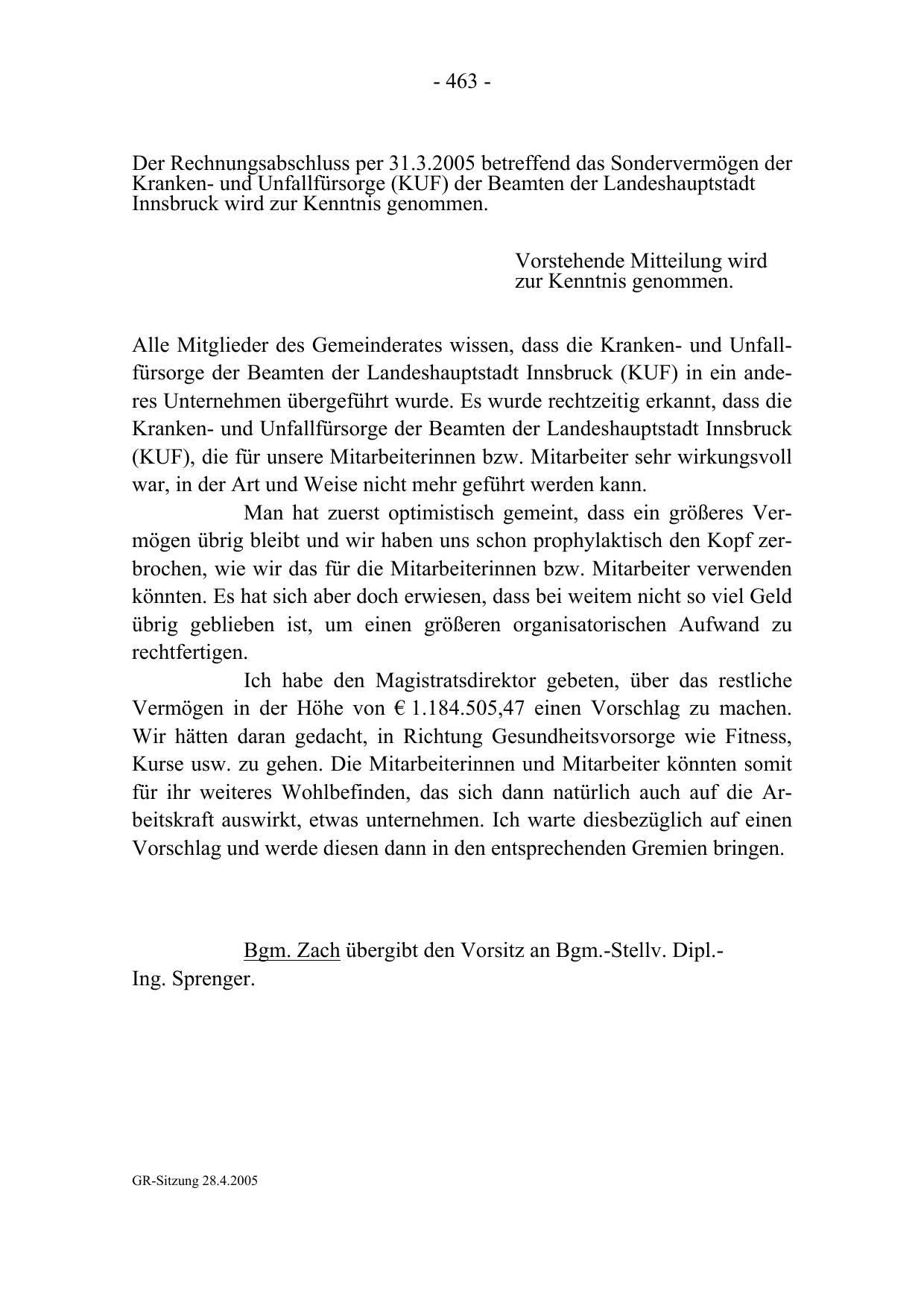 Alle Mitglieder des Gemeinderates wissen, dass die Kranken- und Unfallfürsorge der Beamten der Landeshauptstadt Innsbruck (KUF) in ein anderes Unternehmen übergeführt wurde. Es wurde rechtzeitig erkannt, dass die