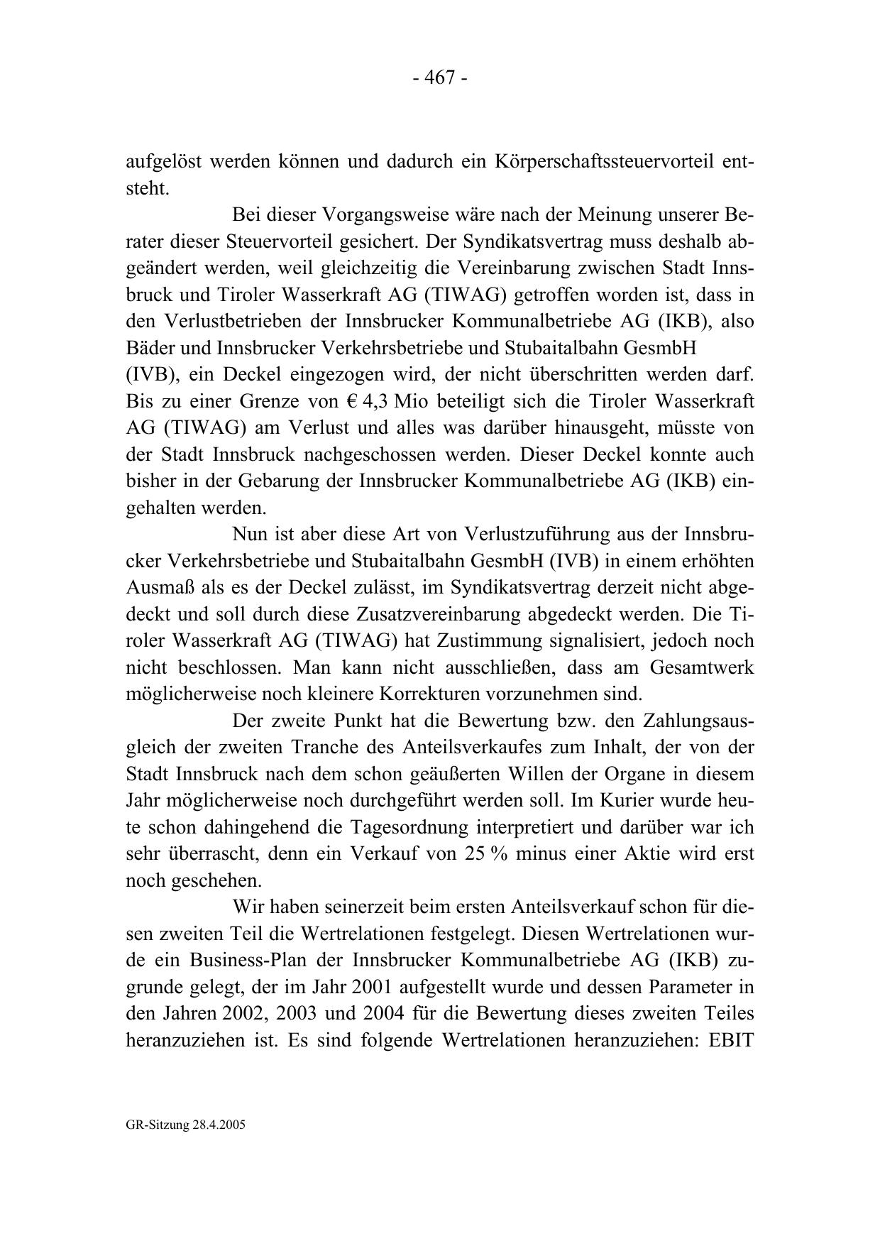 Wir haben seinerzeit beim ersten Anteilsverkauf schon für diesen zweiten Teil die Wertrelationen festgelegt. Diesen Wertrelationen wurde ein Business-Plan der Innsbrucker Kommunalbetriebe AG (IKB) zugrunde gelegt, der im Jahr 2001 aufgestellt wurde und dessen Parameter in