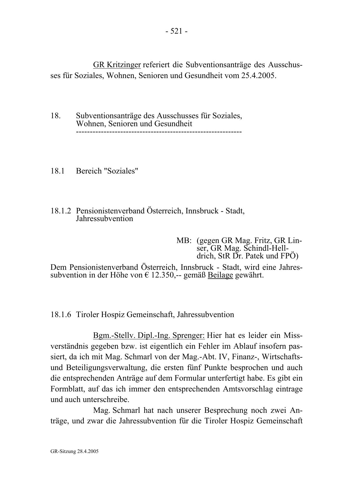 GR Kritzinger referiert die Subventionsanträge des Ausschusses für Soziales, Wohnen, Senioren und Gesundheit vom 25.4.2005.