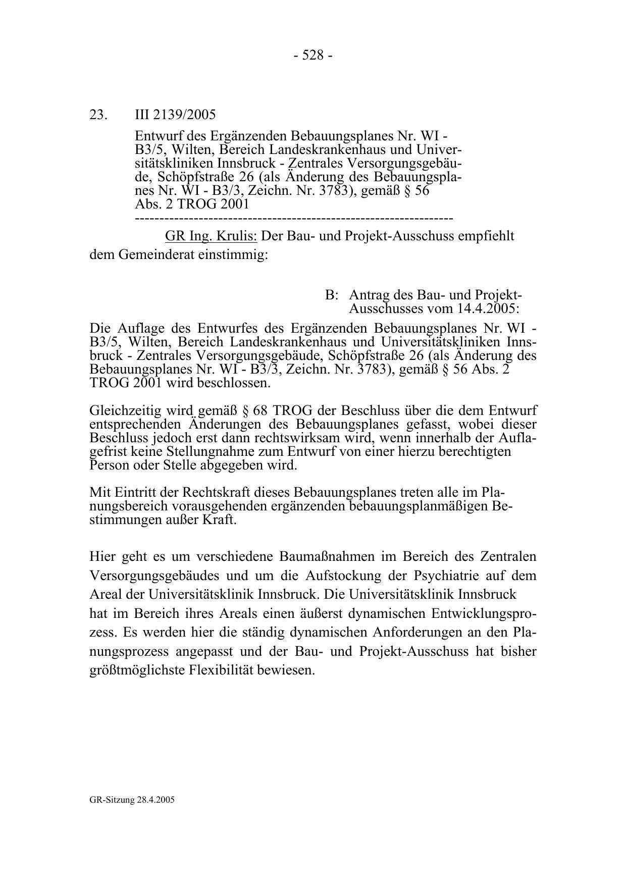 Entwurf des Ergänzenden Bebauungsplanes Nr. WI B3/5, Wilten, Bereich Landeskrankenhaus und Universitätskliniken Innsbruck - Zentrales Versorgungsgebäude, Schöpfstraße 26 (als Änderung des Bebauungsplanes Nr. WI - B3/3, Zeichn. Nr. 3783), gemäß § 56
