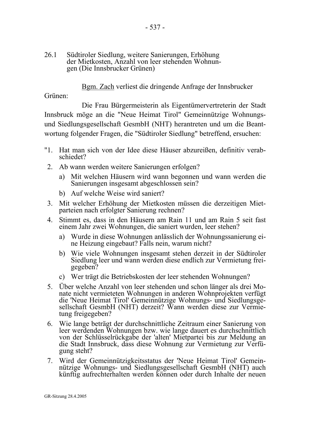 Bgm. Zach verliest die dringende Anfrage der Innsbrucker