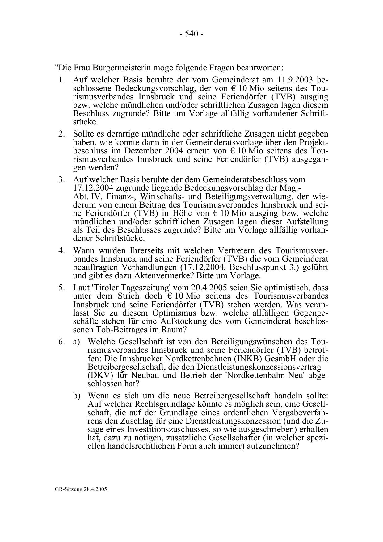 17.12.2004 zugrunde liegende Bedeckungsvorschlag der Mag.Abt. IV, Finanz-, Wirtschafts- und Beteiligungsverwaltung, der wiederum von einem Beitrag des Tourismusverbandes Innsbruck und seine Feriendörfer (TVB) in Höhe von € 10 Mio ausging bzw. welche