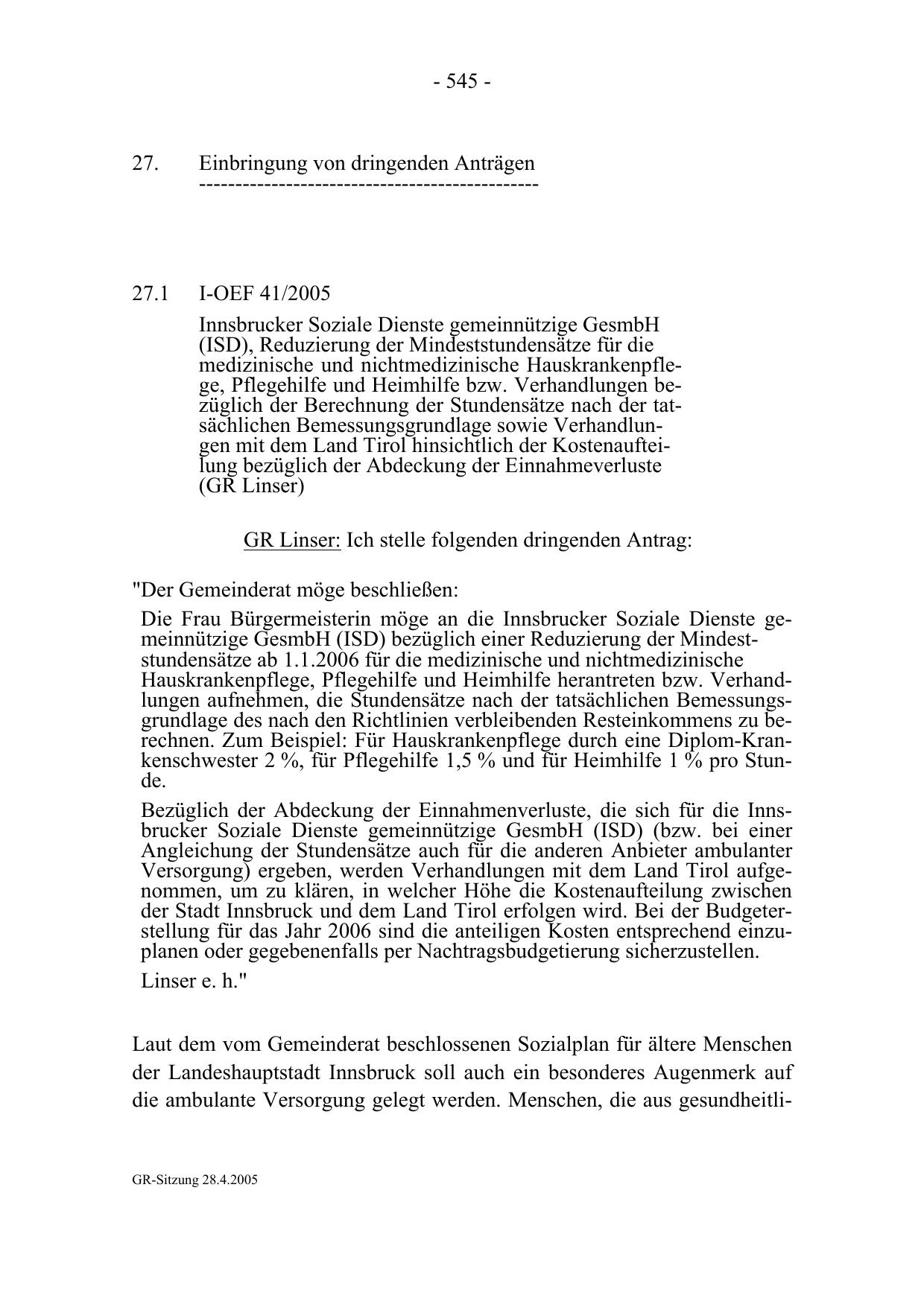 Die Frau Bürgermeisterin möge an die Innsbrucker Soziale Dienste gemeinnützige GesmbH (ISD) bezüglich einer Reduzierung der Mindeststundensätze ab 1.1.2006 für die medizinische und nichtmedizinische