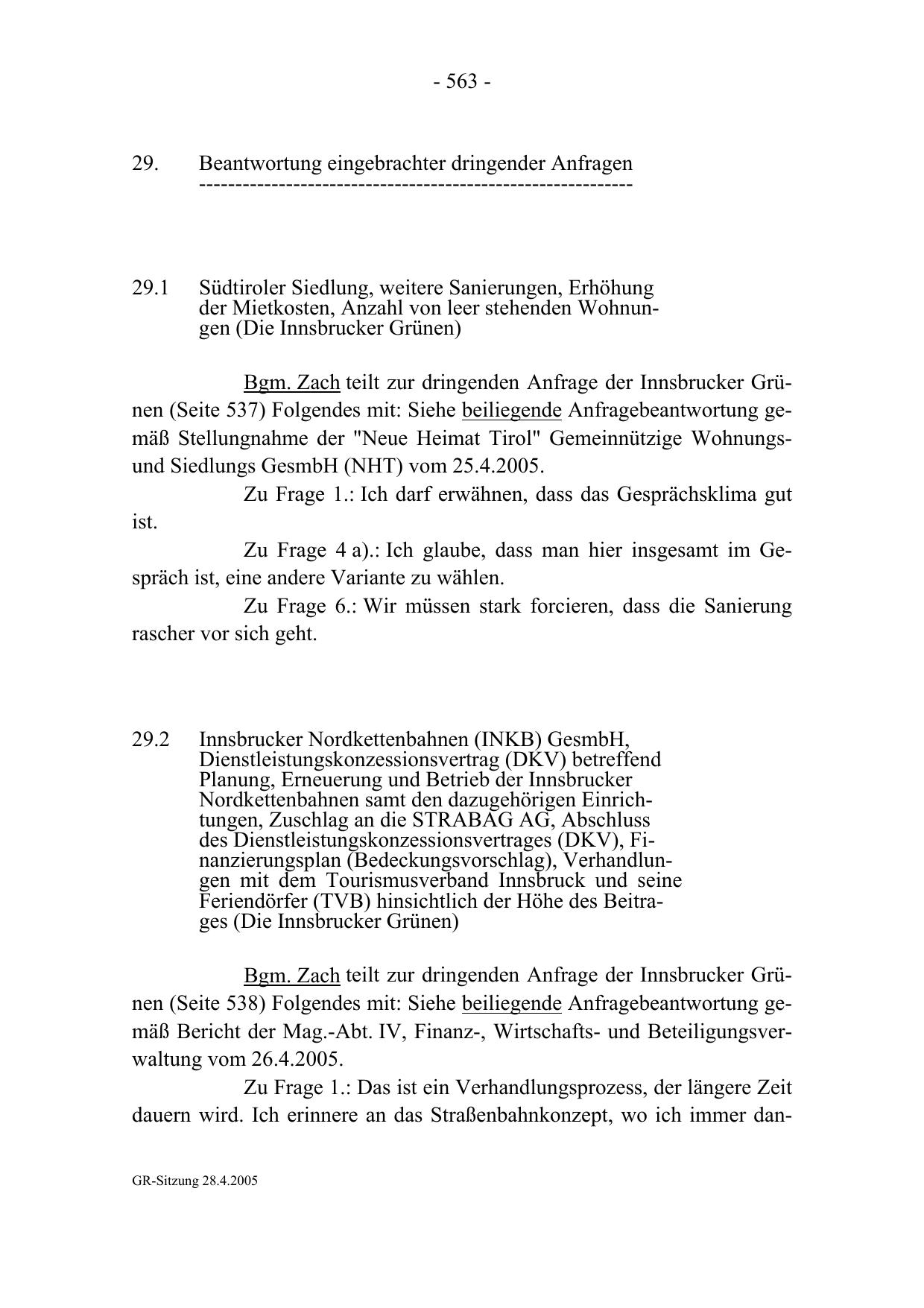 Bgm. Zach teilt zur dringenden Anfrage der Innsbrucker Grünen (Seite 538) Folgendes mit: Siehe beiliegende Anfragebeantwortung gemäß Bericht der Mag.-Abt. IV, Finanz-, Wirtschafts- und Beteiligungsverwaltung vom 26.4.2005.