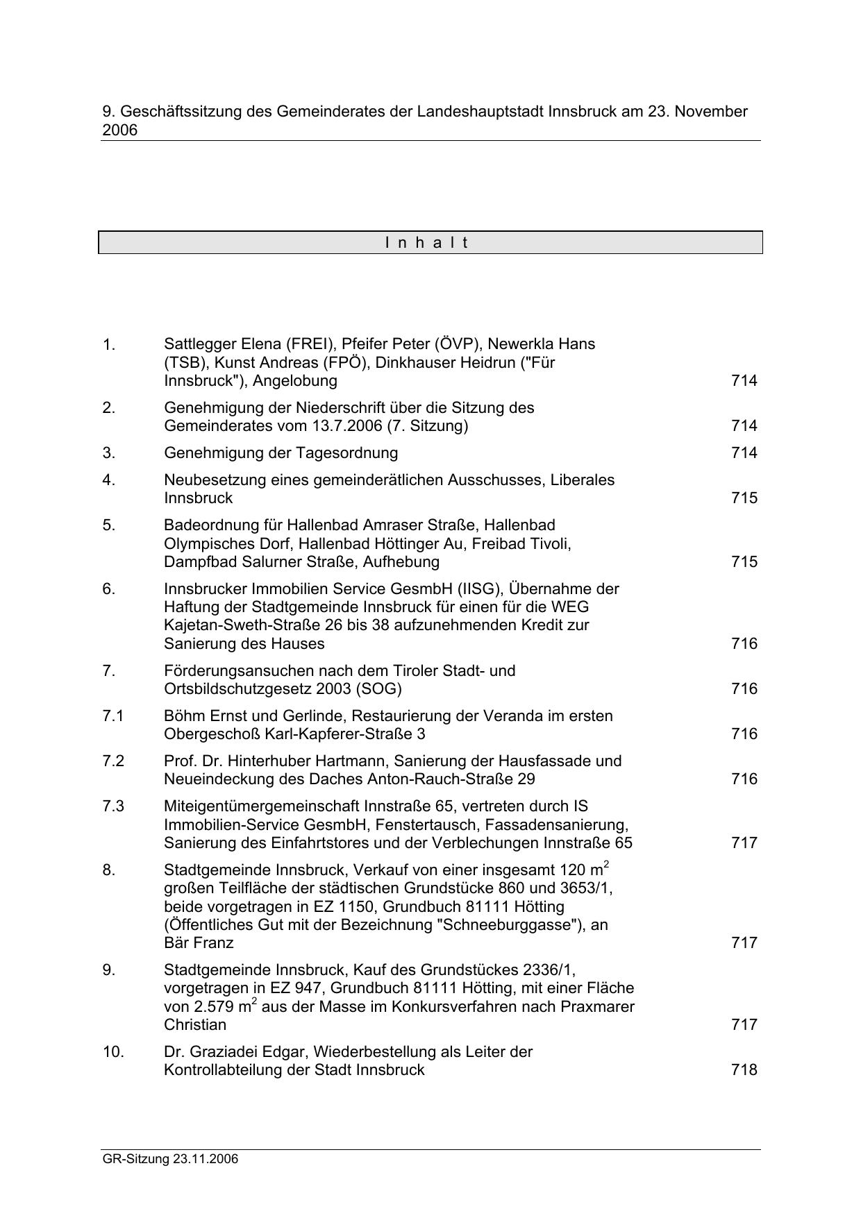 9. Geschäftssitzung des Gemeinderates der Landeshauptstadt Innsbruck am 23. November