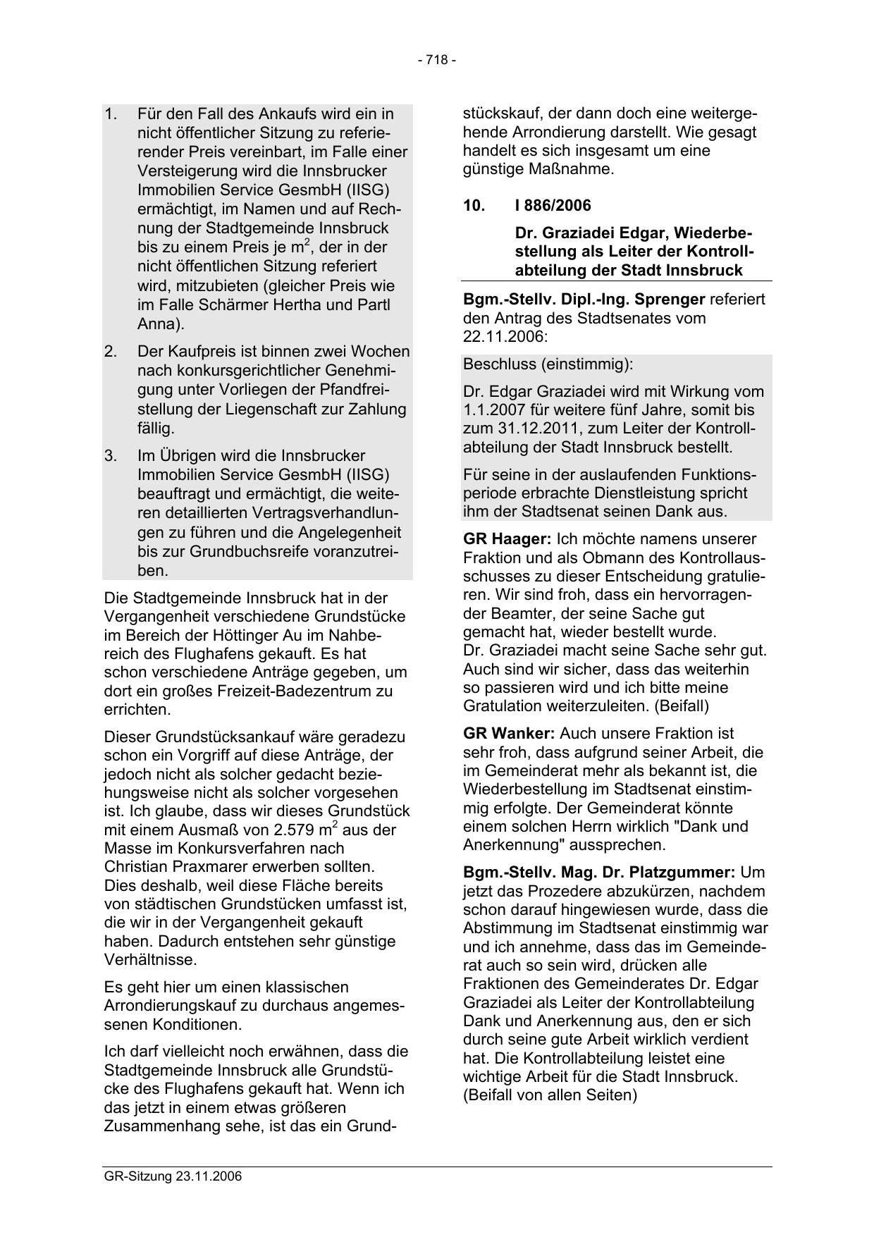 Dr. Graziadei Edgar, Wiederbestellung als Leiter der Kontrollabteilung der Stadt Innsbruck
