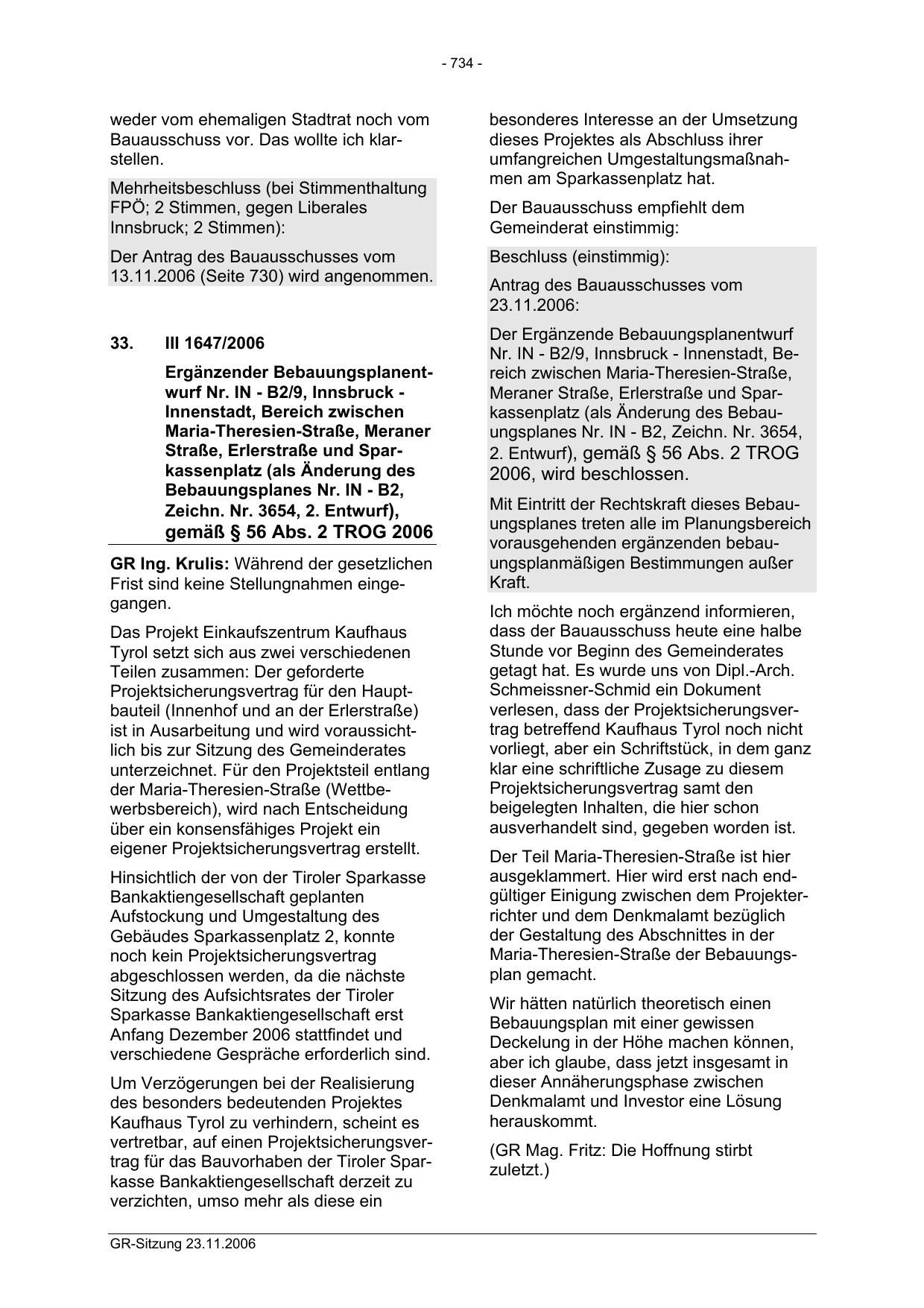 verlesen, dass der Projektsicherungsvertrag betreffend Kaufhaus Tyrol noch nicht