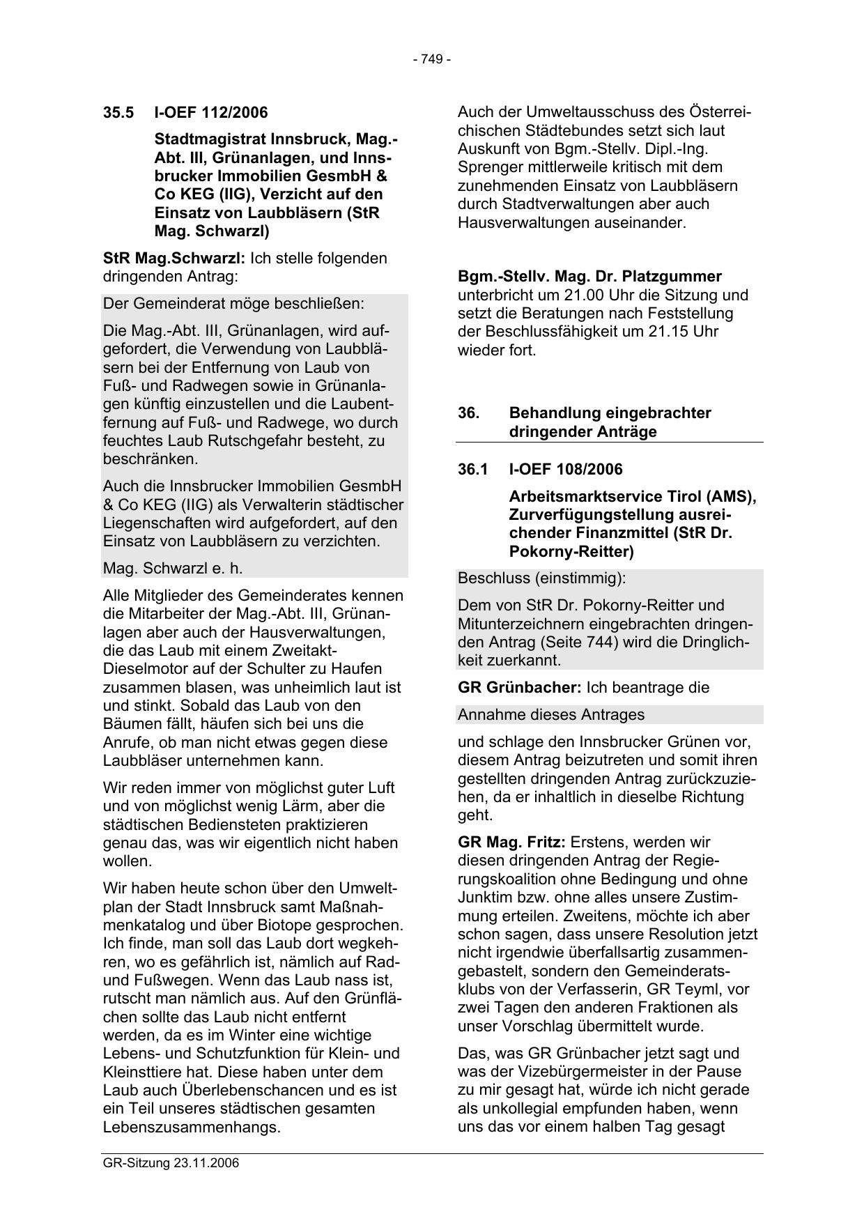 Wir haben heute schon über den Umweltplan der Stadt Innsbruck samt Maßnahmenkatalog und über Biotope gesprochen.