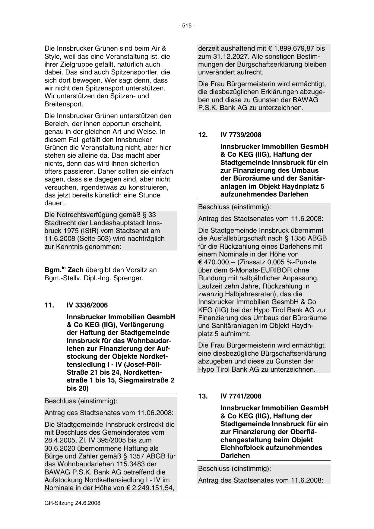 Innsbruck für das Wohnbaudarlehen zur Finanzierung der Aufstockung der Objekte Nordkettensiedlung I - IV (Josef-PöllStraße 21 bis 24, Nordkettenstraße 1 bis 15, Siegmairstraße 2