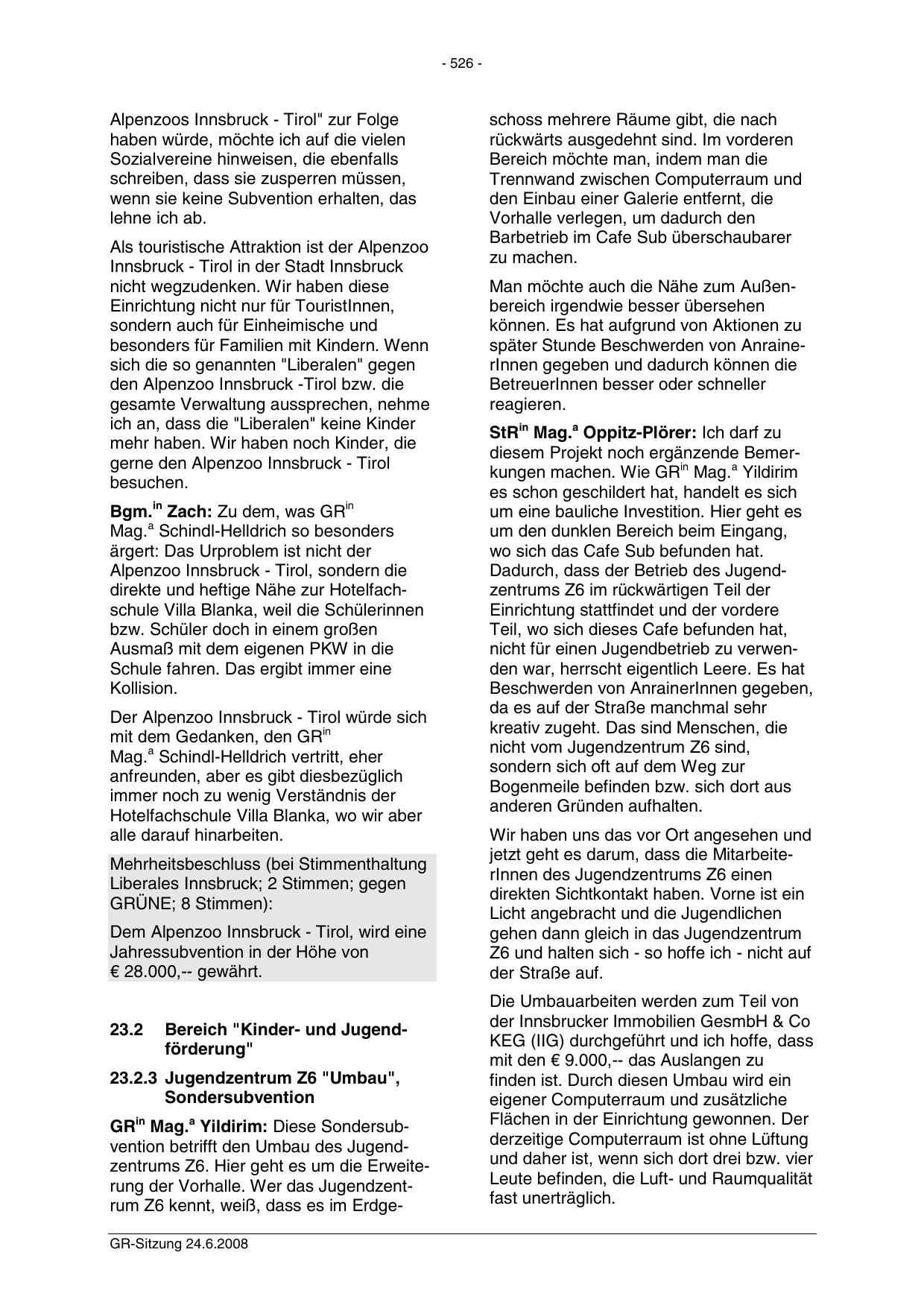 GRin Mag.a Yildirim: Diese Sondersubvention betrifft den Umbau des Jugendzentrums Z6. Hier geht es um die Erweiterung der Vorhalle. Wer das Jugendzentrum Z6 kennt, weiß, dass es im ErdgeGR-Sitzung 24.6.2008