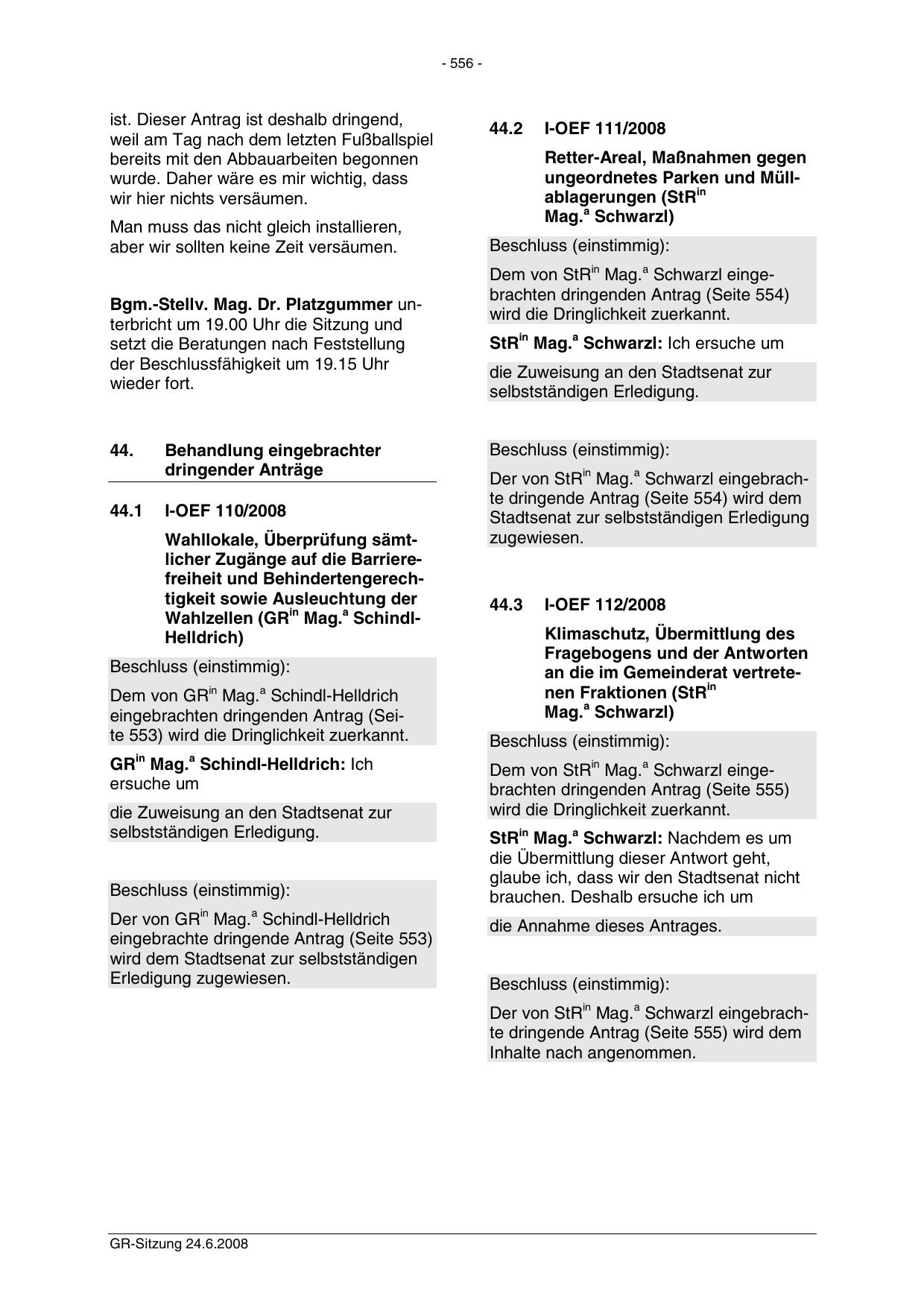 Dem von StRin Mag.a Schwarzl eingebrachten dringenden Antrag (Seite 554)
