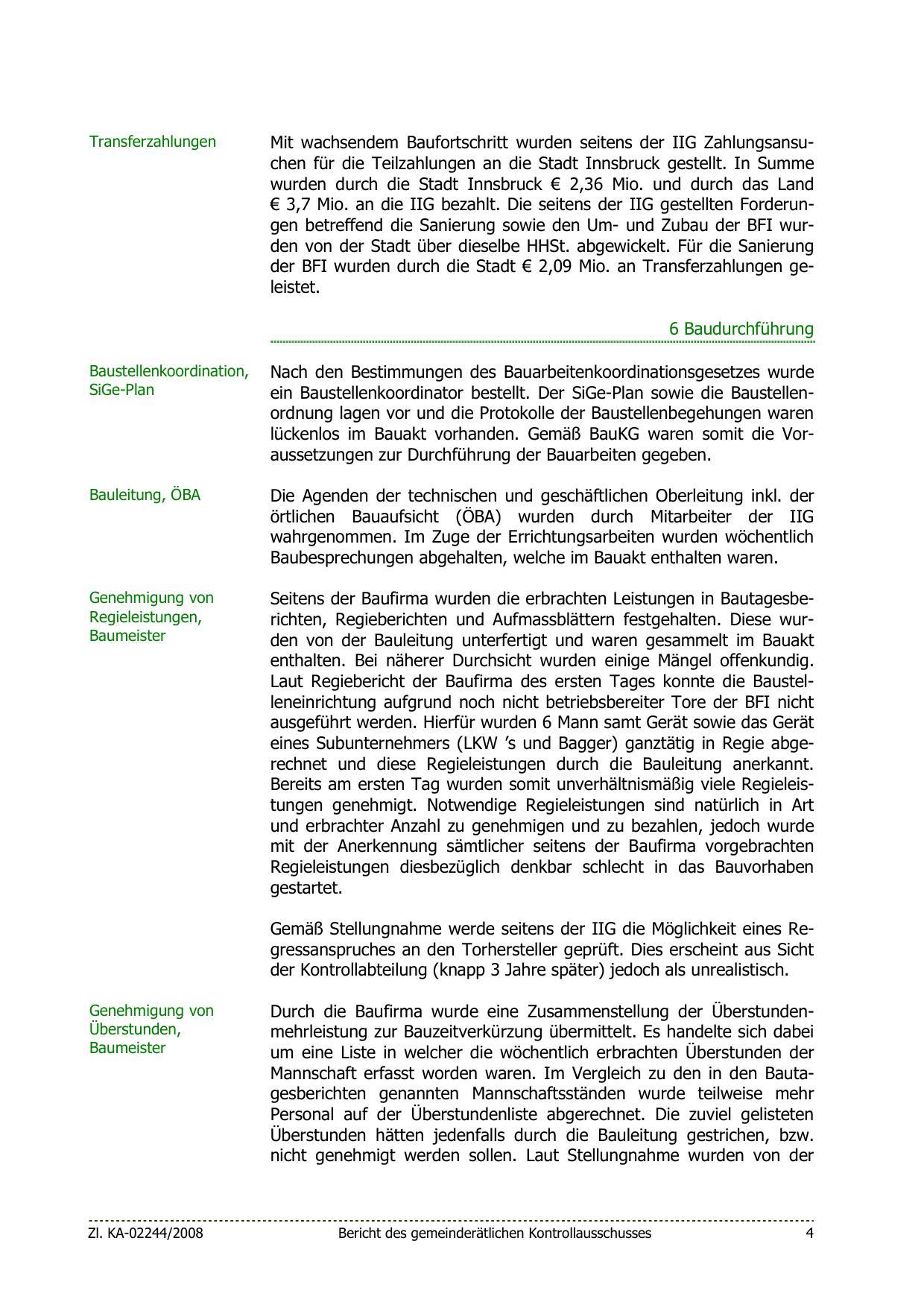€ 3,7 Mio. an die IIG bezahlt. Die seitens der IIG gestellten Forderungen betreffend die Sanierung sowie den Um- und Zubau der BFI wurden von der Stadt über dieselbe HHSt. abgewickelt. Für die Sanierung