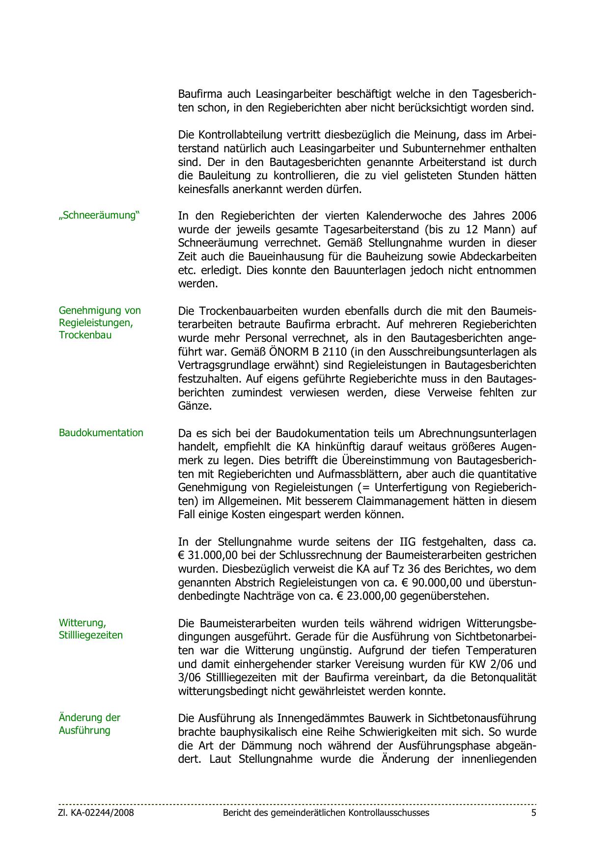 handelt, empfiehlt die KA hinkünftig darauf weitaus größeres Augenmerk zu legen. Dies betrifft die Übereinstimmung von Bautagesberichten mit Regieberichten und Aufmassblättern, aber auch die quantitative