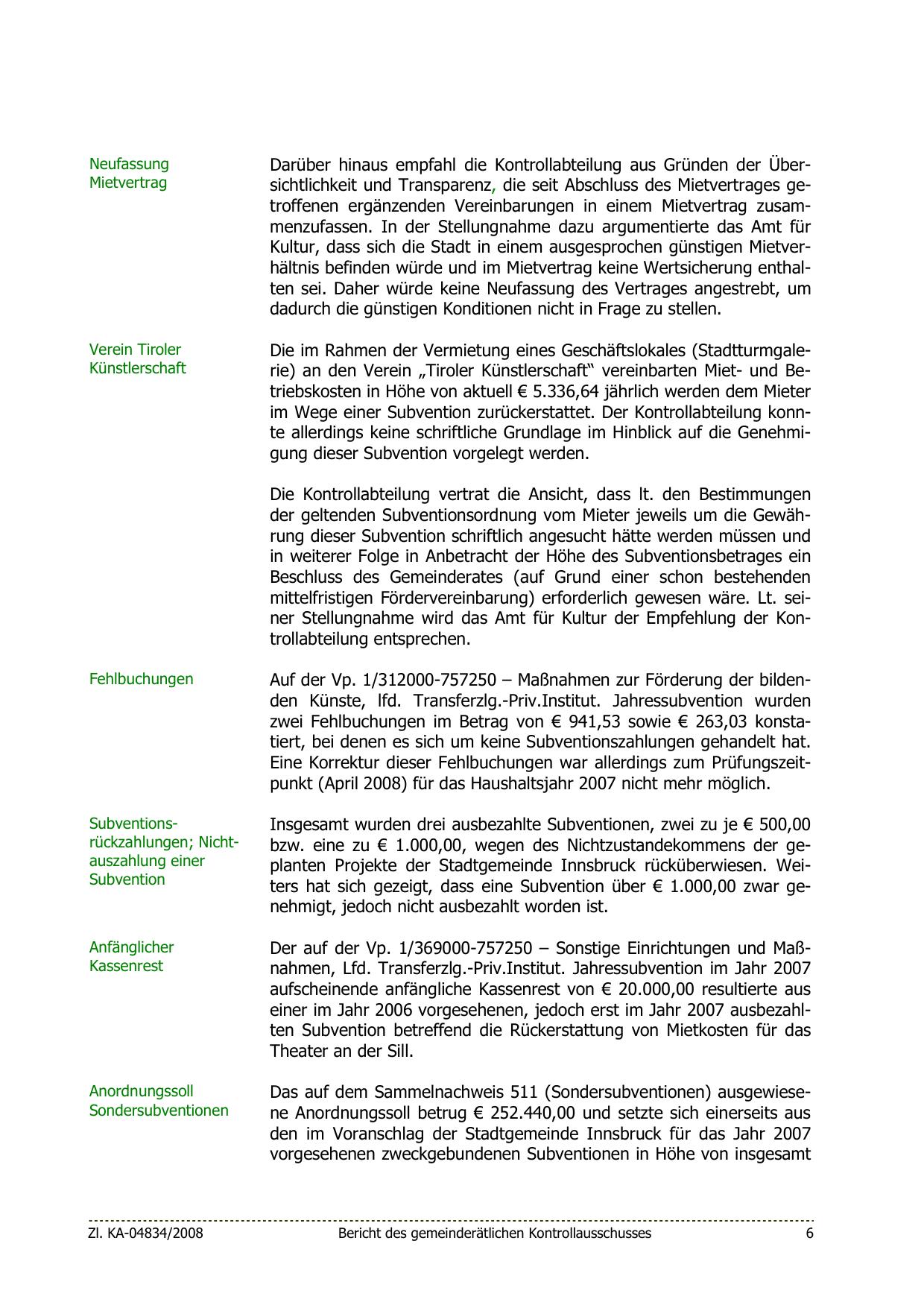 bzw. eine zu € 1.000,00, wegen des Nichtzustandekommens der geplanten Projekte der Stadtgemeinde Innsbruck rücküberwiesen. Weiters hat sich gezeigt, dass eine Subvention über € 1.000,00 zwar genehmigt, jedoch nicht ausbezahlt worden ist.
