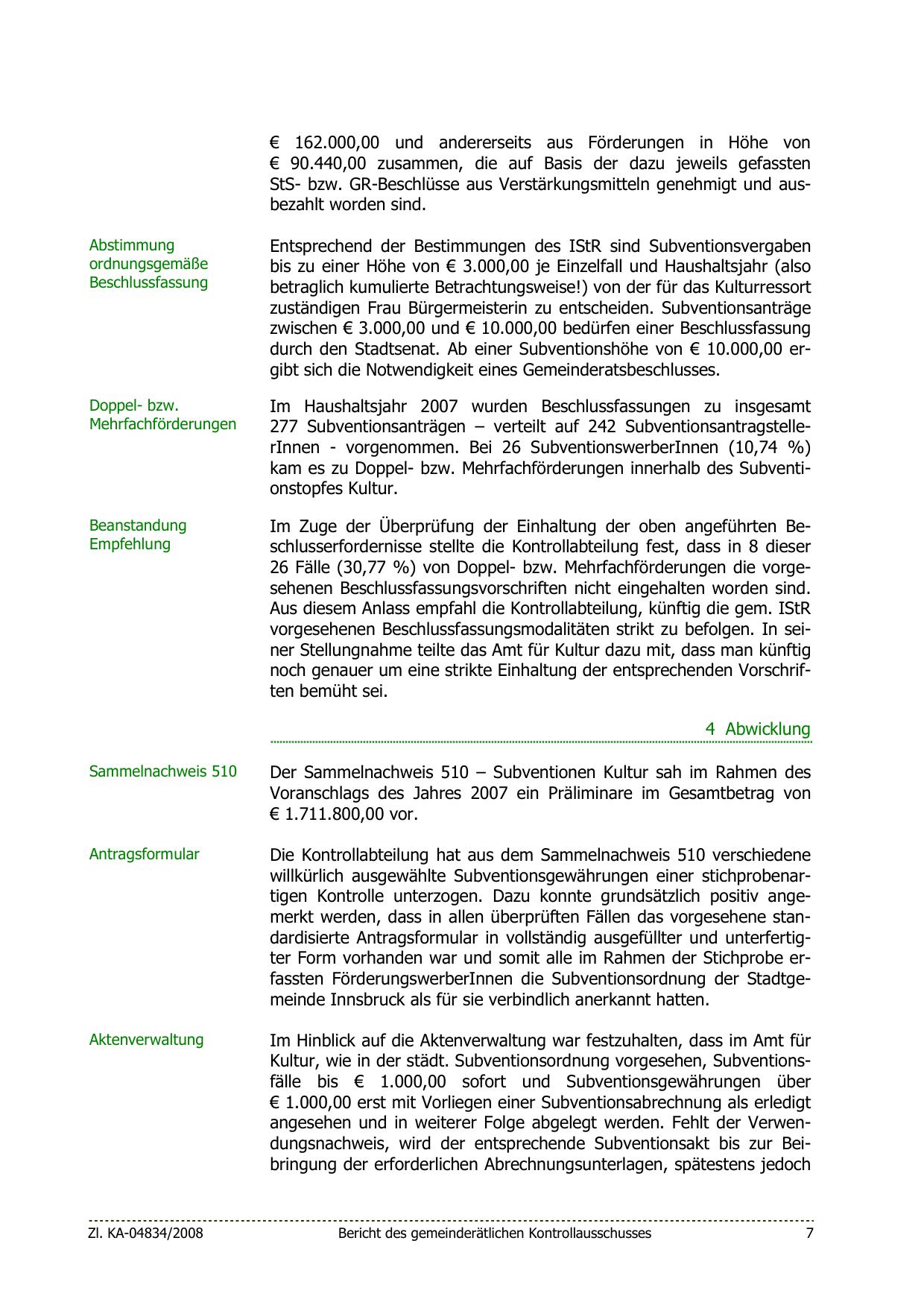 willkürlich ausgewählte Subventionsgewährungen einer stichprobenartigen Kontrolle unterzogen. Dazu konnte grundsätzlich positiv angemerkt werden, dass in allen überprüften Fällen das vorgesehene standardisierte Antragsformular in vollständig ausgefüllter und unterfertigter Form vorhanden war und somit alle im Rahmen der Stichprobe erfassten FörderungswerberInnen die Subventionsordnung der Stadtgemeinde Innsbruck als für sie verbindlich anerkannt hatten.