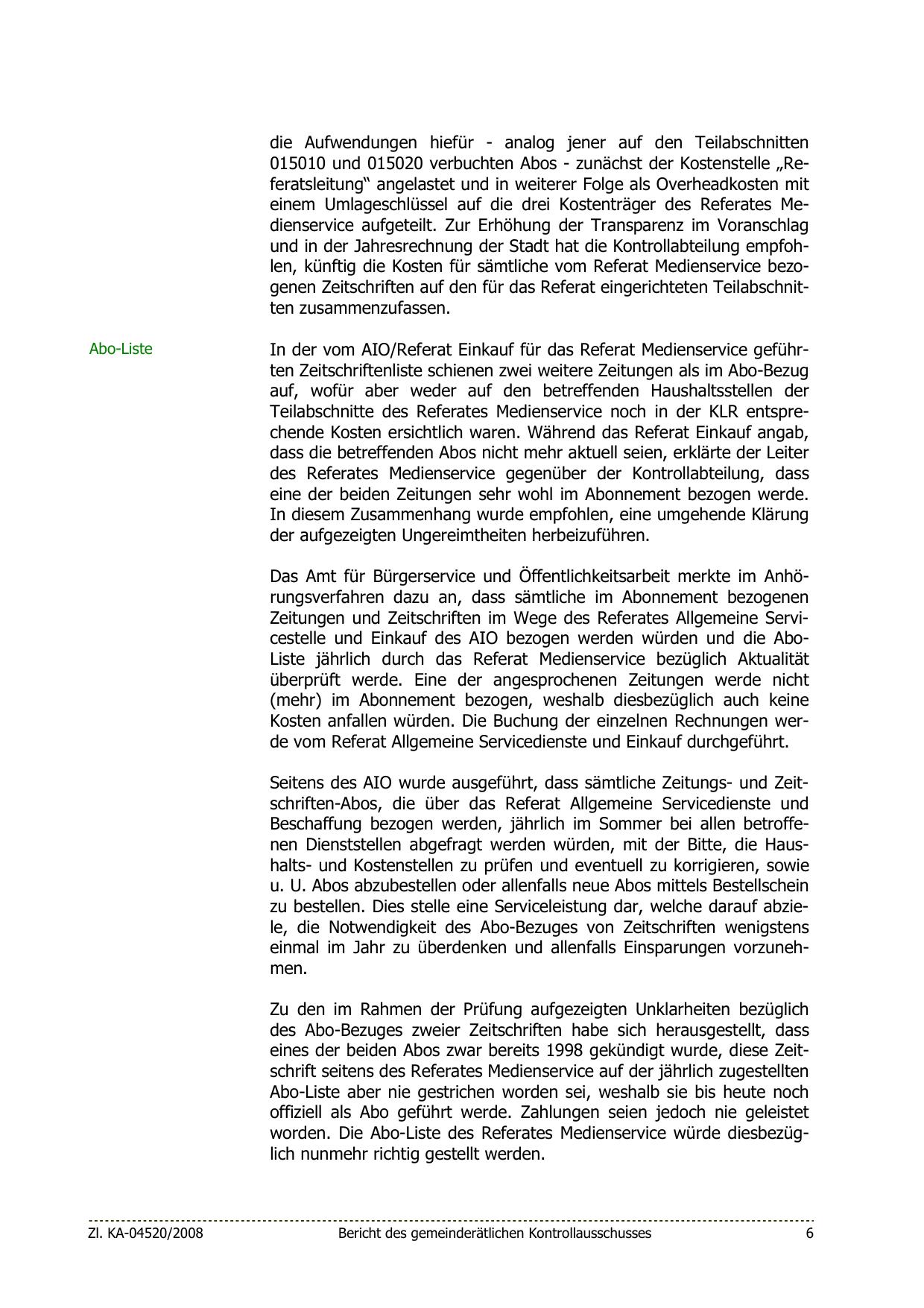 und in der Jahresrechnung der Stadt hat die Kontrollabteilung empfohlen, künftig die Kosten für sämtliche vom Referat Medienservice bezogenen Zeitschriften auf den für das Referat eingerichteten Teilabschnitten zusammenzufassen.