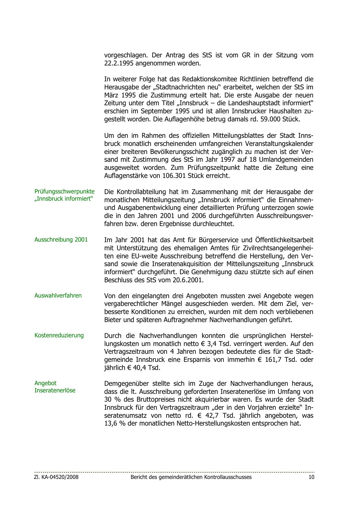 mit Unterstützung des ehemaligen Amtes für Zivilrechtsangelegenheiten eine EU-weite Ausschreibung betreffend die Herstellung, den Versand sowie die Inseratenakquisition der Mitteilungszeitung „Innsbruck