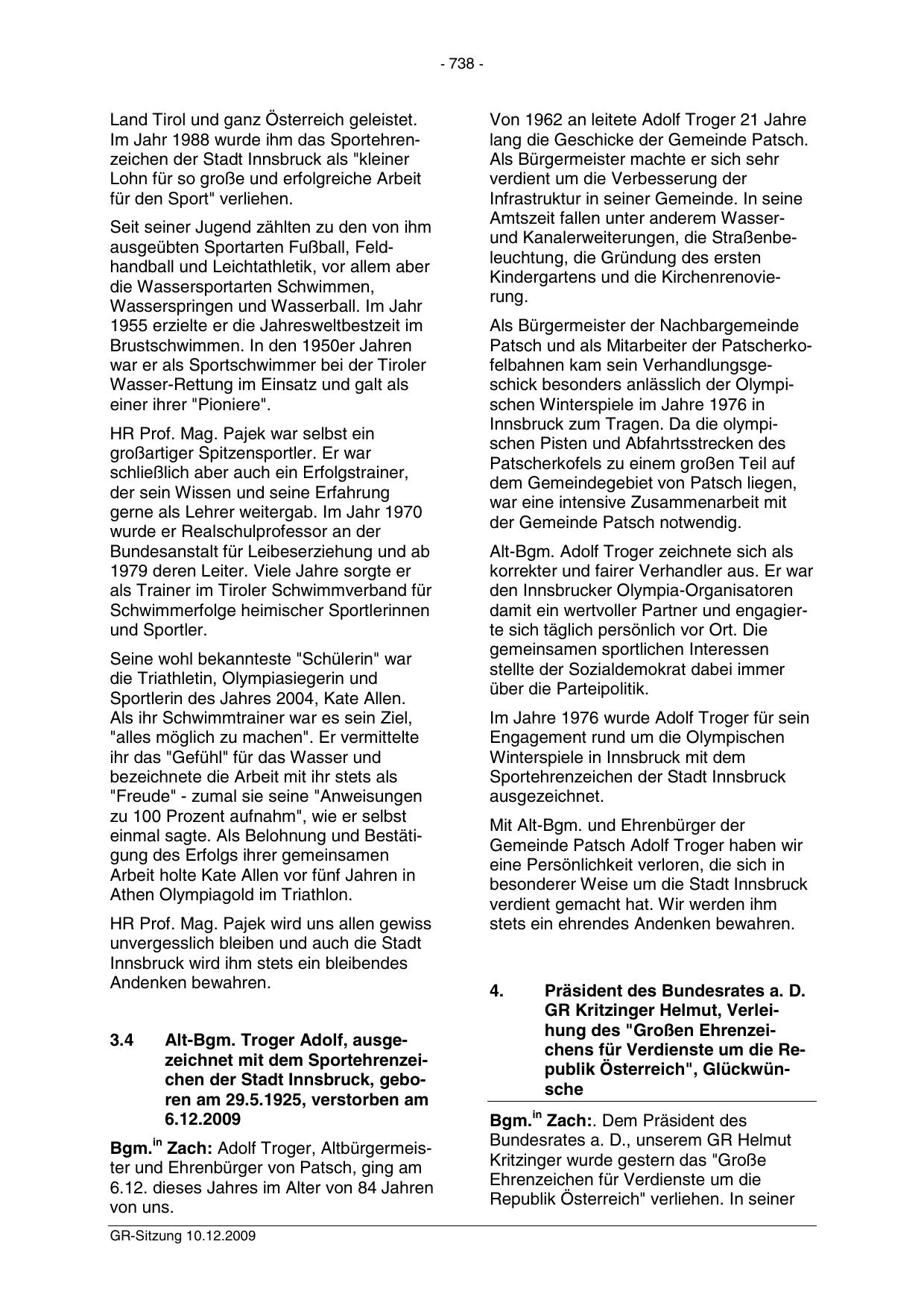 Alt-Bgm. Troger Adolf, ausgezeichnet mit dem Sportehrenzeichen der Stadt Innsbruck, geboren am 29.5.1925, verstorben am