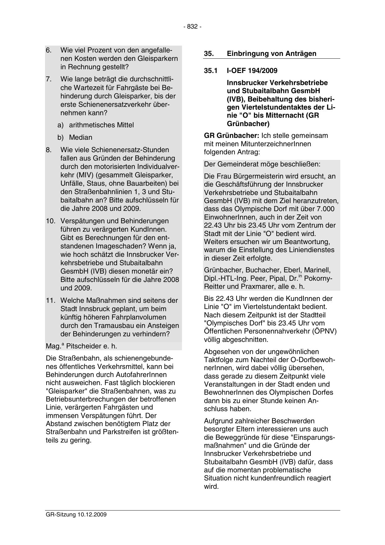 (IVB), Beibehaltung des bisherigen Viertelstundentaktes der Linie "O" bis Mitternacht (GR