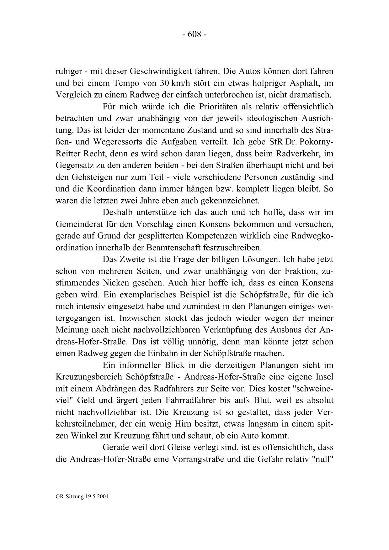 betrachten und zwar unabhängig von der jeweils ideologischen Ausrichtung. Das ist leider der momentane Zustand und so sind innerhalb des Straßen- und Wegeressorts die Aufgaben verteilt. Ich gebe StR Dr. PokornyReitter Recht, denn es wird schon daran liegen, dass beim Radverkehr, im