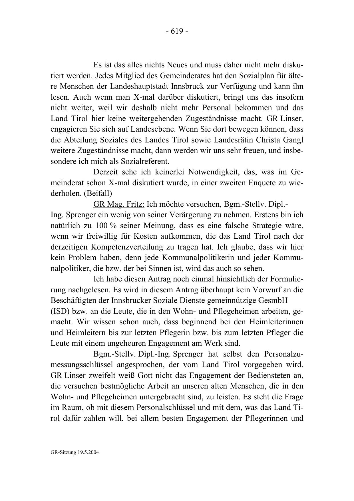 Es ist das alles nichts Neues und muss daher nicht mehr diskutiert werden. Jedes Mitglied des Gemeinderates hat den Sozialplan für ältere Menschen der Landeshauptstadt Innsbruck zur Verfügung und kann ihn