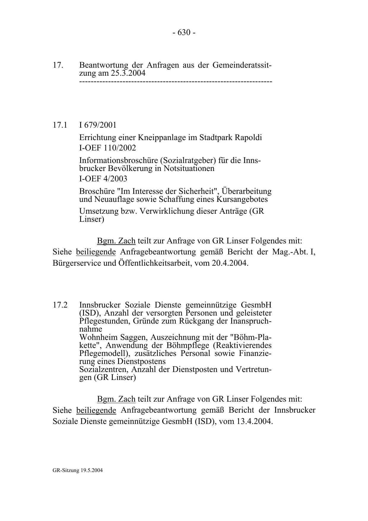 Beantwortung der Anfragen aus der Gemeinderatssitzung am 25.3.2004