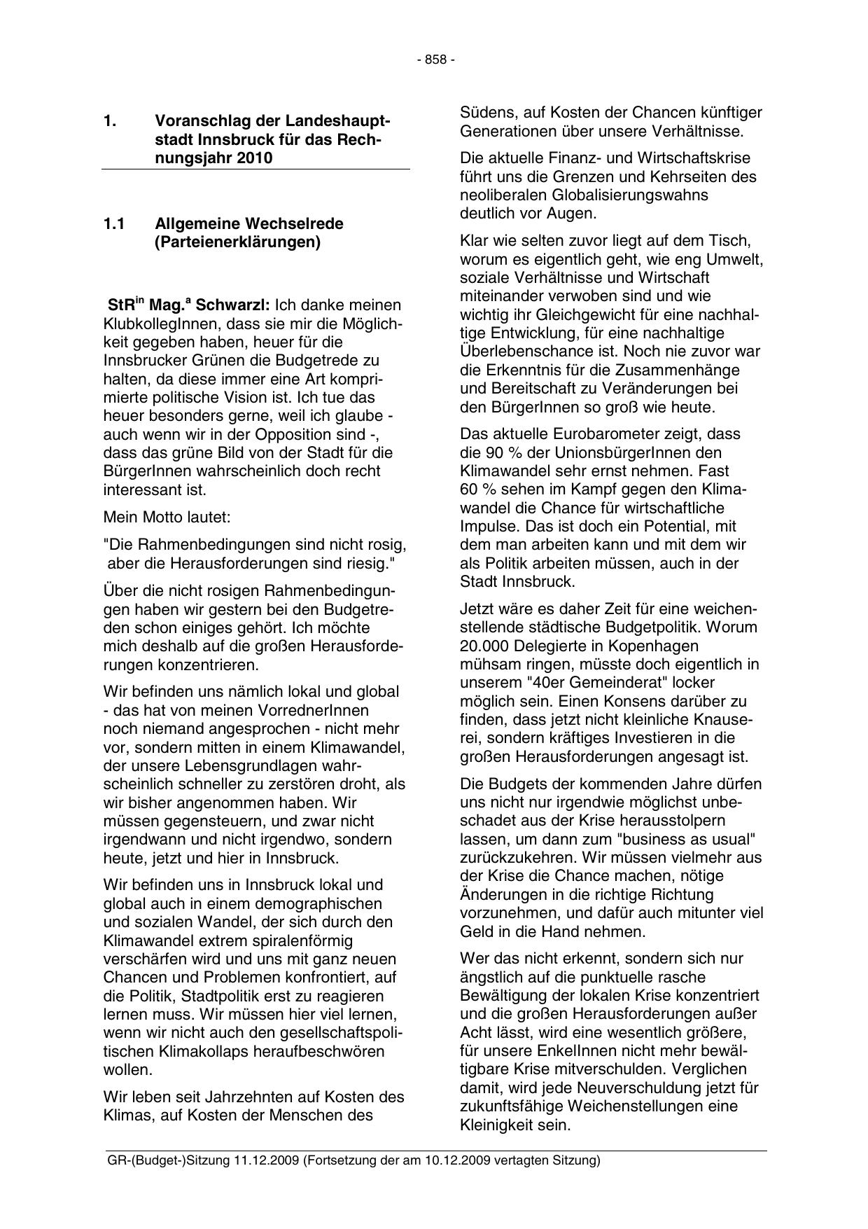 GR-(Budget-)Sitzung 11.12.2009 (Fortsetzung der am 10.12.2009 vertagten Sitzung)