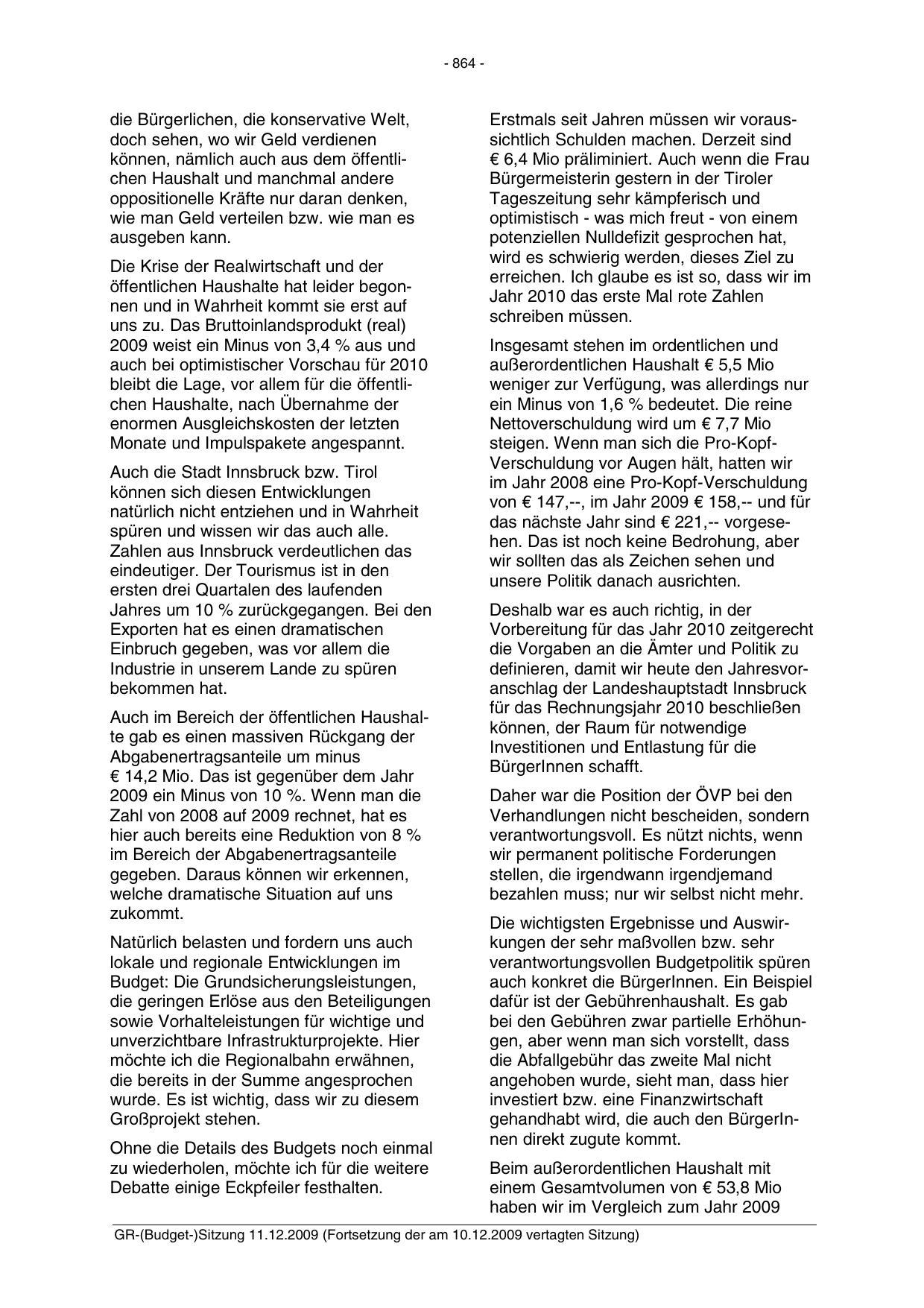 GR-(Budget-)Sitzung 11.12.2009 (Fortsetzung der am 10.12.2009 vertagten Sitzung)