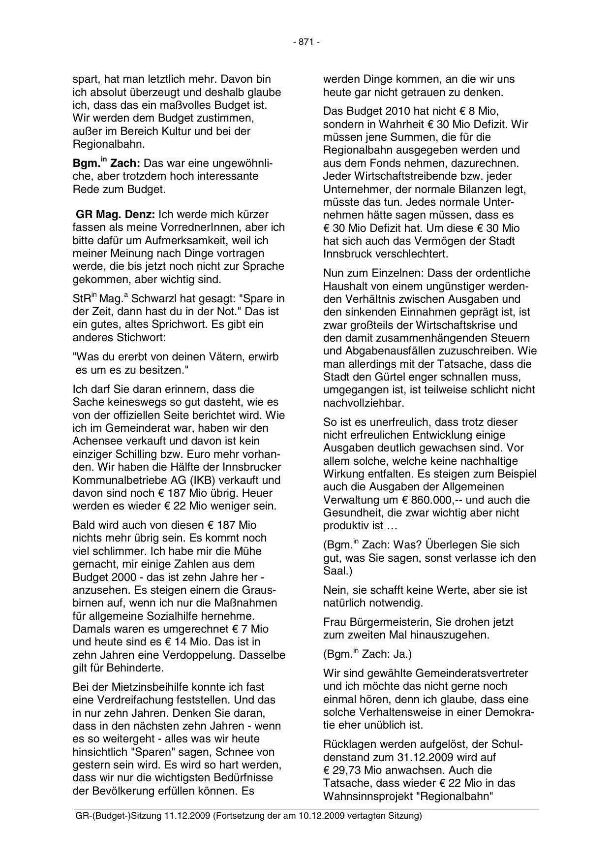 GR-(Budget-)Sitzung 11.12.2009 (Fortsetzung der am 10.12.2009 vertagten Sitzung)