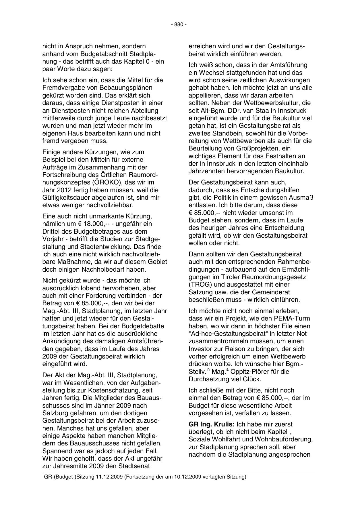 hatten und jetzt wieder für den Gestaltungsbeirat haben. Bei der Budgetdebatte