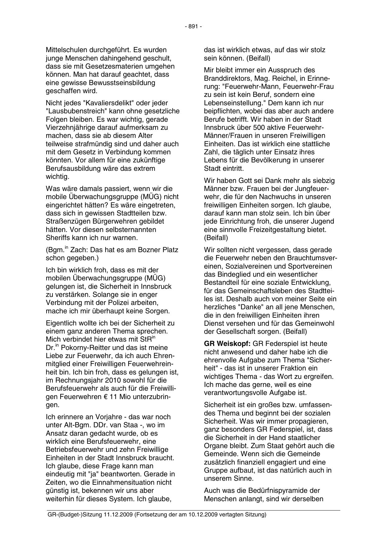 GR-(Budget-)Sitzung 11.12.2009 (Fortsetzung der am 10.12.2009 vertagten Sitzung)