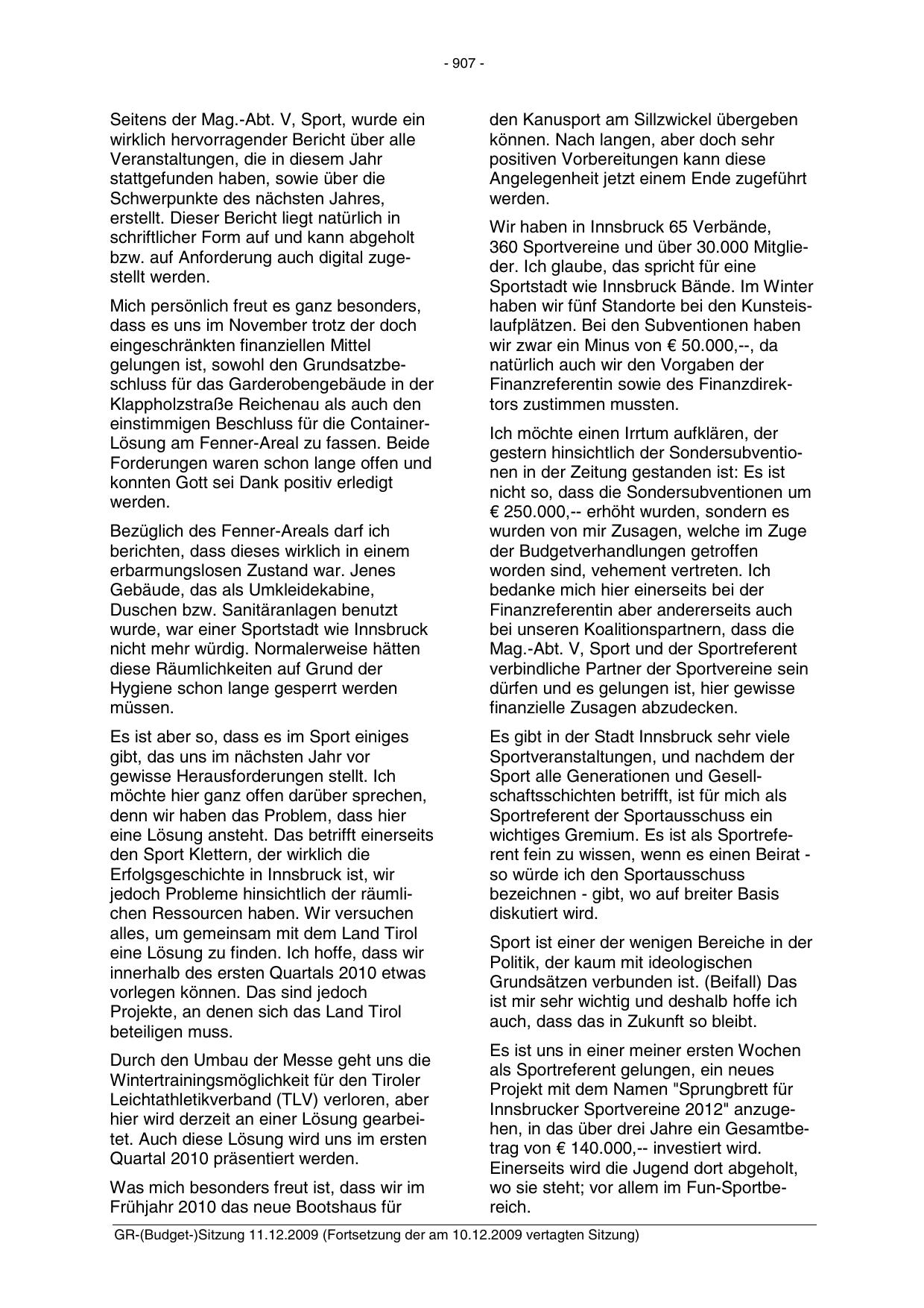 GR-(Budget-)Sitzung 11.12.2009 (Fortsetzung der am 10.12.2009 vertagten Sitzung)