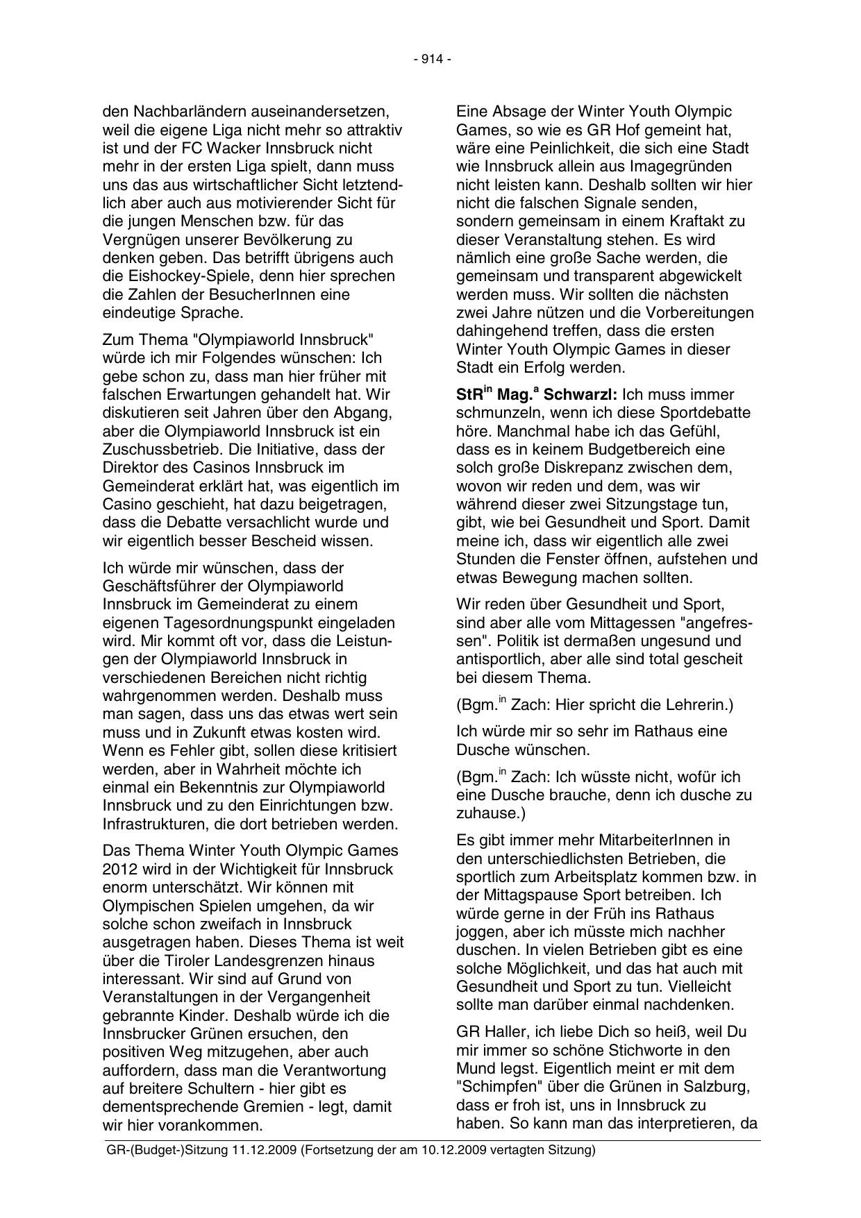 GR-(Budget-)Sitzung 11.12.2009 (Fortsetzung der am 10.12.2009 vertagten Sitzung)