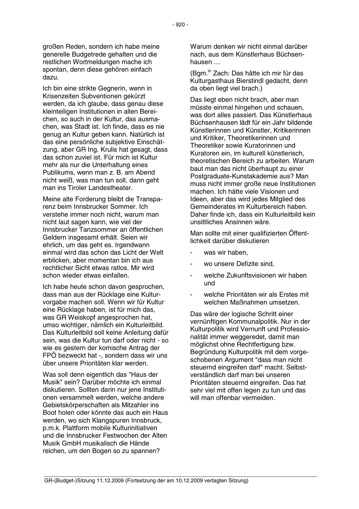 GR-(Budget-)Sitzung 11.12.2009 (Fortsetzung der am 10.12.2009 vertagten Sitzung)