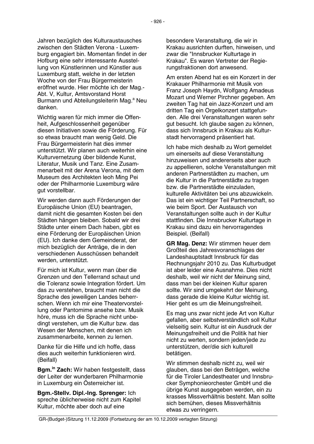 GR-(Budget-)Sitzung 11.12.2009 (Fortsetzung der am 10.12.2009 vertagten Sitzung)