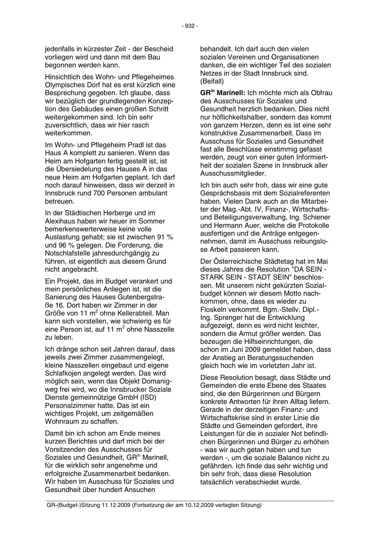 GR-(Budget-)Sitzung 11.12.2009 (Fortsetzung der am 10.12.2009 vertagten Sitzung)