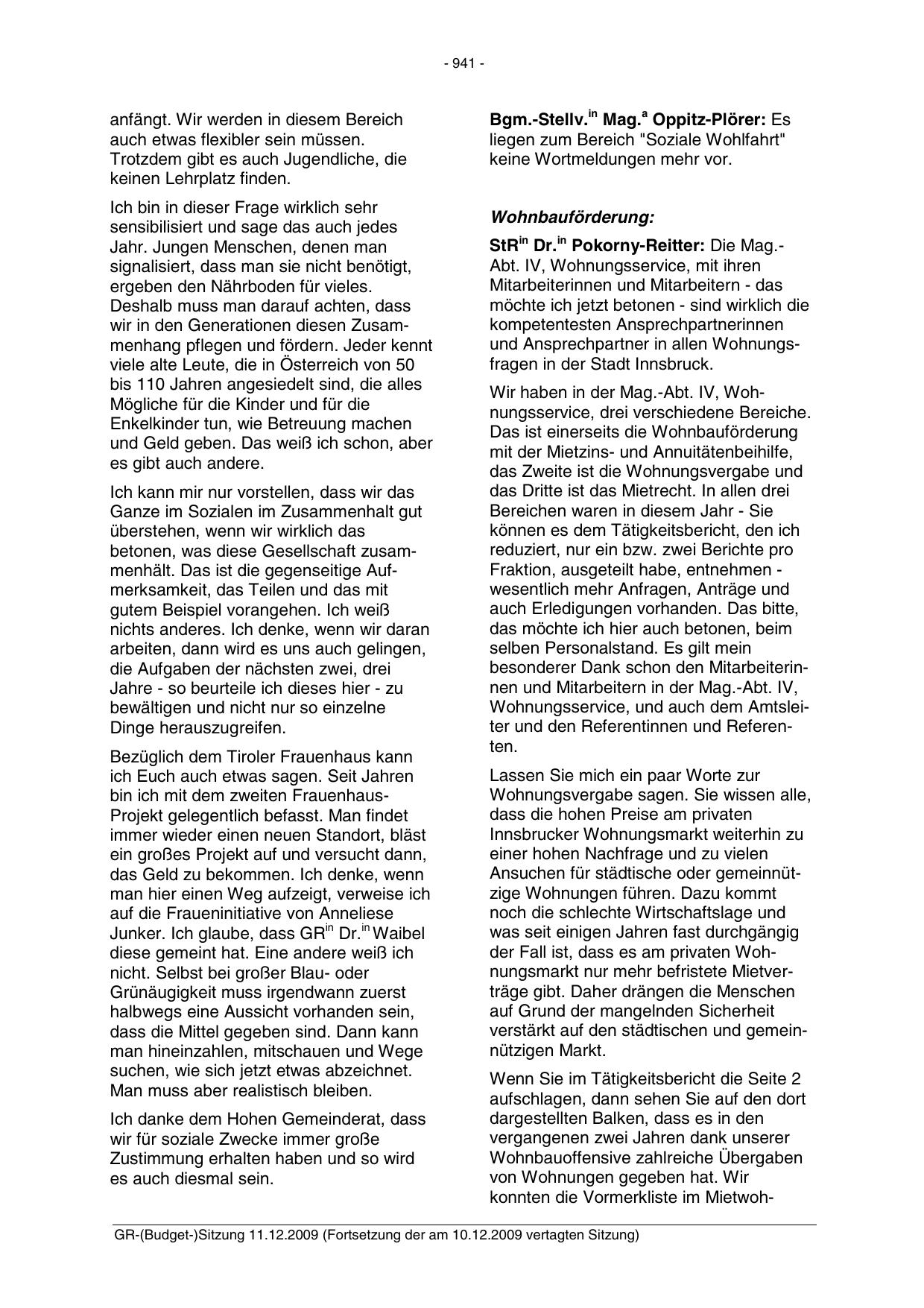 GR-(Budget-)Sitzung 11.12.2009 (Fortsetzung der am 10.12.2009 vertagten Sitzung)