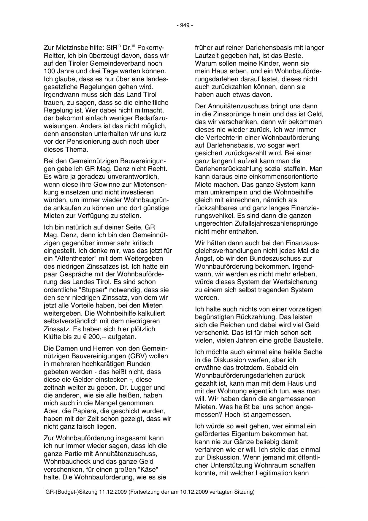 GR-(Budget-)Sitzung 11.12.2009 (Fortsetzung der am 10.12.2009 vertagten Sitzung)