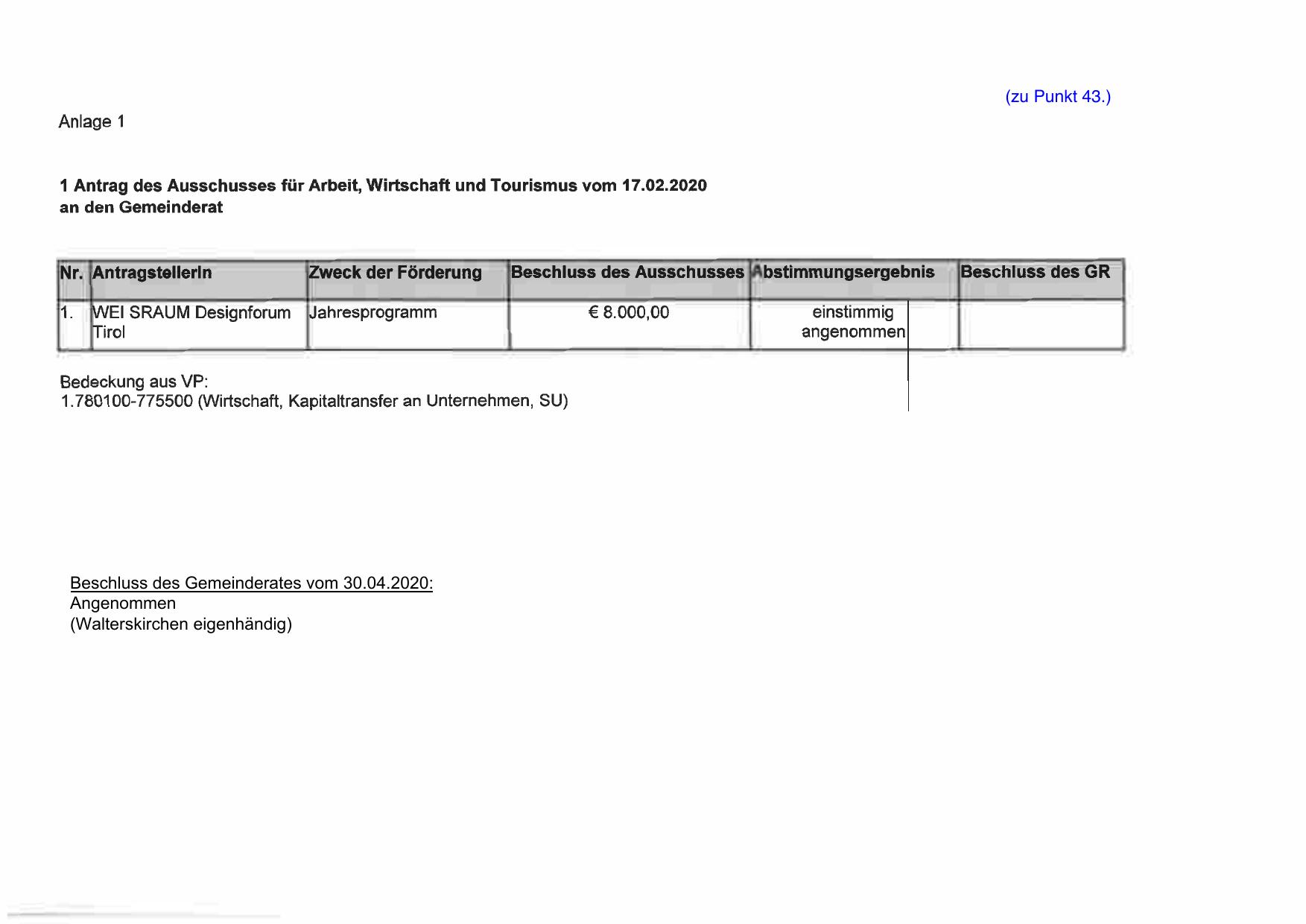 1 Antrag des Ausschusses für Arbeit, Wirtschaft und Tourismus vom 17.02.2020