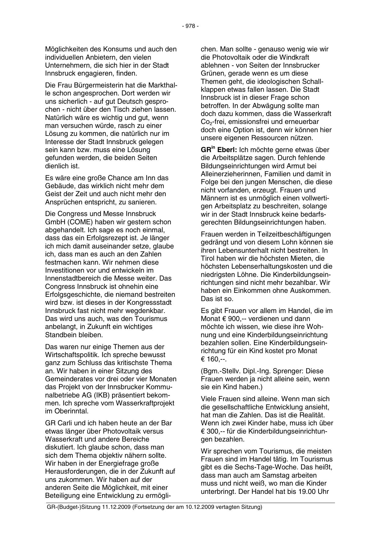 GR-(Budget-)Sitzung 11.12.2009 (Fortsetzung der am 10.12.2009 vertagten Sitzung)