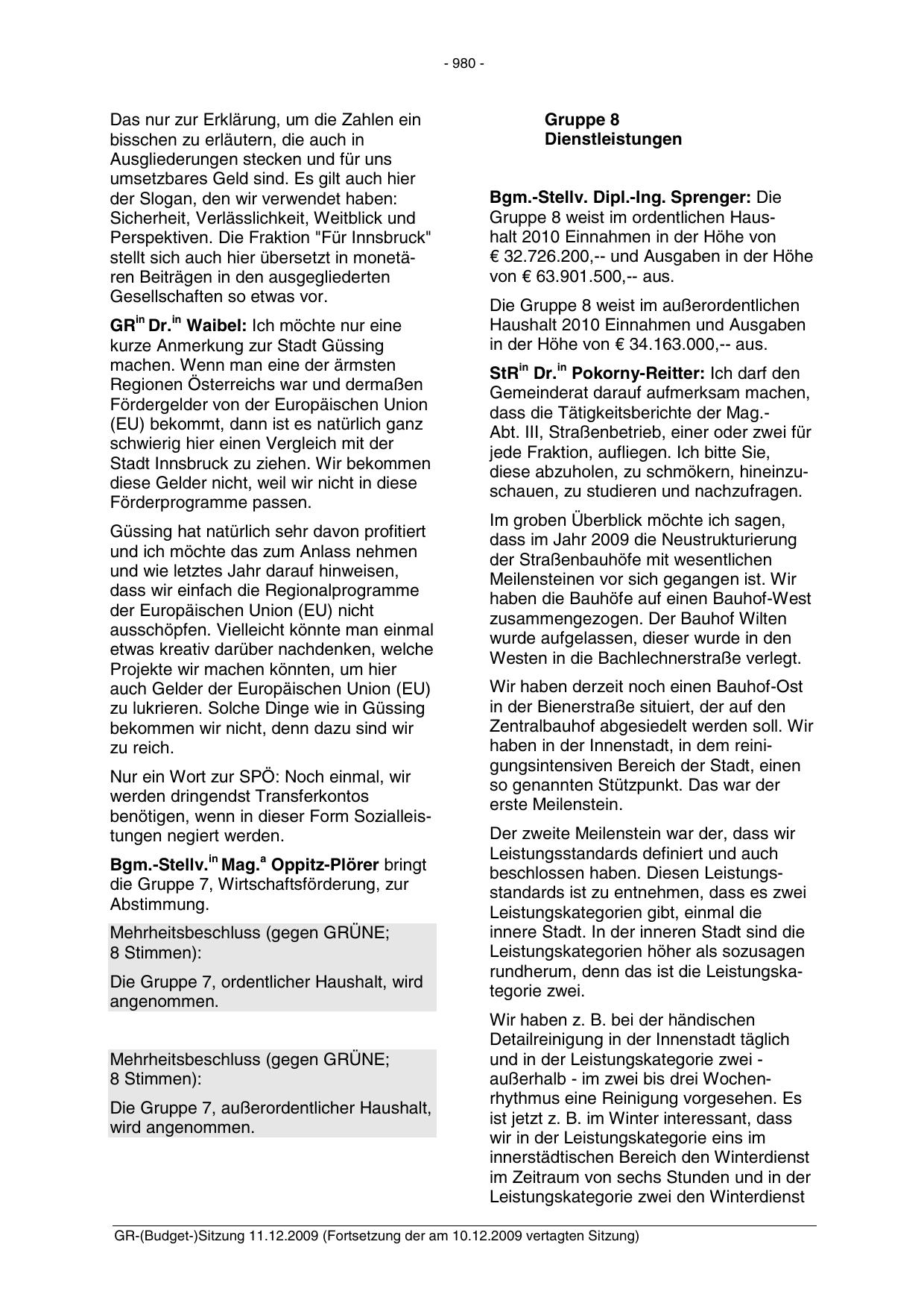 GR-(Budget-)Sitzung 11.12.2009 (Fortsetzung der am 10.12.2009 vertagten Sitzung)
