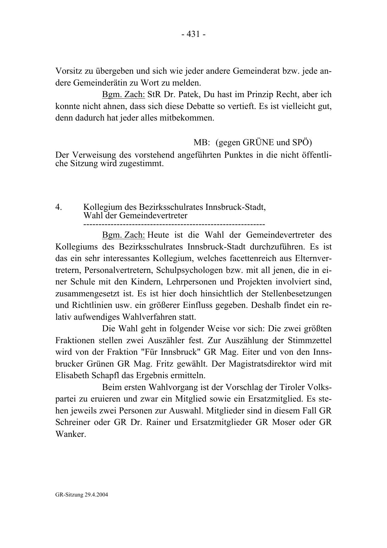 wird von der Fraktion "Für Innsbruck" GR Mag. Eiter und von den Innsbrucker Grünen GR Mag. Fritz gewählt. Der Magistratsdirektor wird mit