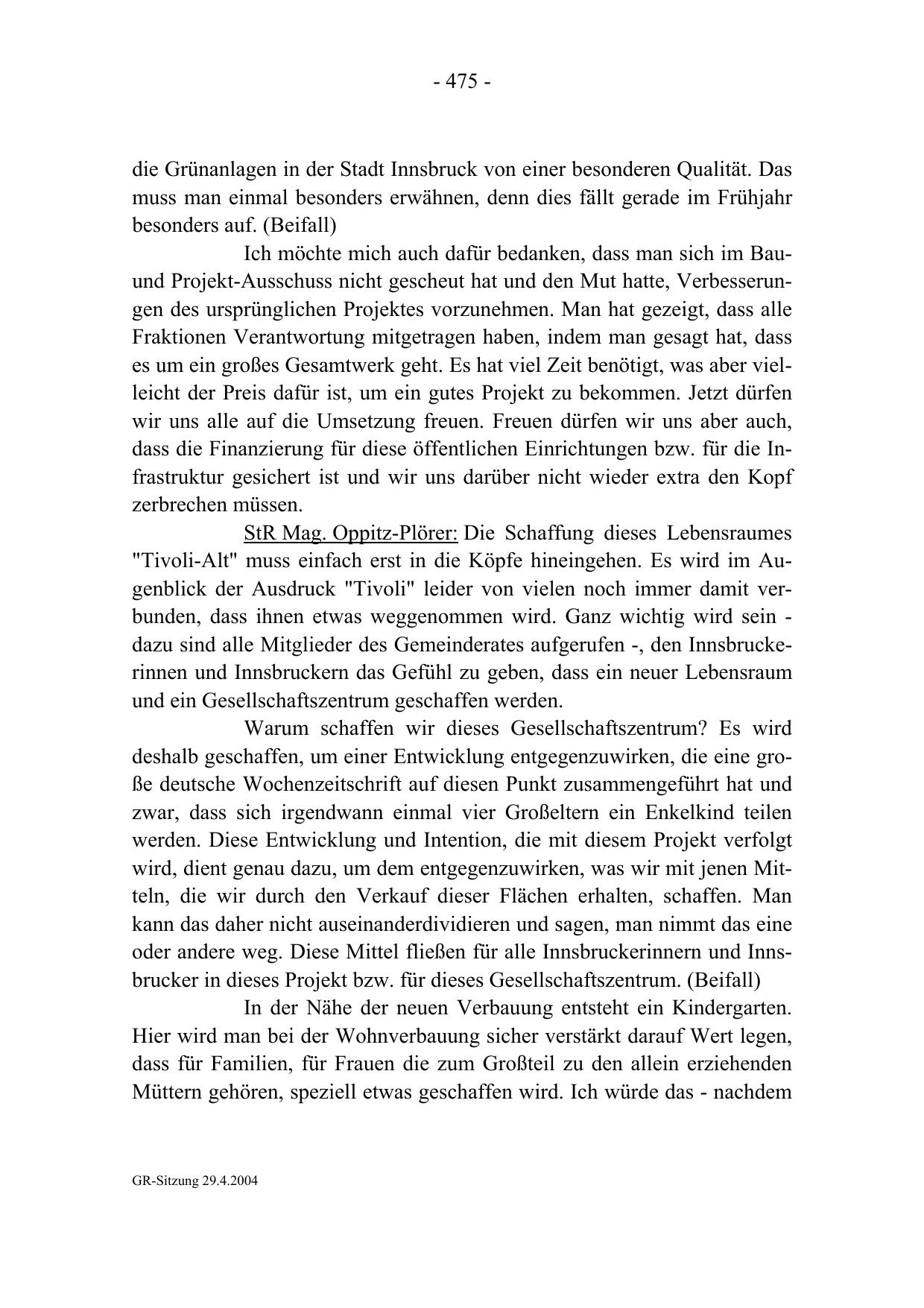 "Tivoli-Alt" muss einfach erst in die Köpfe hineingehen. Es wird im Augenblick der Ausdruck "Tivoli" leider von vielen noch immer damit verbunden, dass ihnen etwas weggenommen wird. Ganz wichtig wird sein dazu sind alle Mitglieder des Gemeinderates aufgerufen -, den Innsbruckerinnen und Innsbruckern das Gefühl zu geben, dass ein neuer Lebensraum