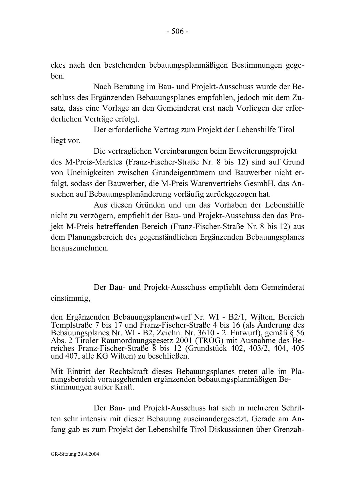 Der Bau- und Projekt-Ausschuss hat sich in mehreren Schritten sehr intensiv mit dieser Bebauung auseinandergesetzt. Gerade am Anfang gab es zum Projekt der Lebenshilfe Tirol Diskussionen über GrenzabGR-Sitzung 29.4.2004